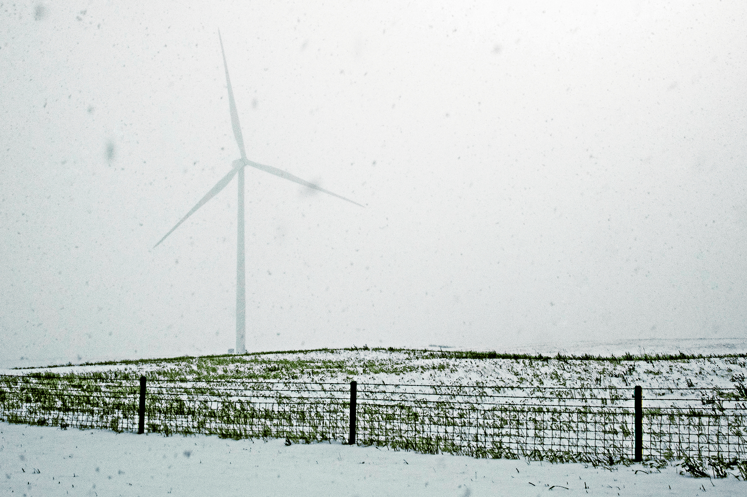 Interstate 80 fenced wind turbine among blowing snow wide angle shot captured outdoors on December 25th 2021 at 12:23 PM during a cold, cloudy, overcast, snowy and windy winter afternoon by Laramie Wyoming photographer Sean Michael Datz using a Nikon D850 camera and Sigma 18-300mm wide angle lens at a focal length distance of 20mm.