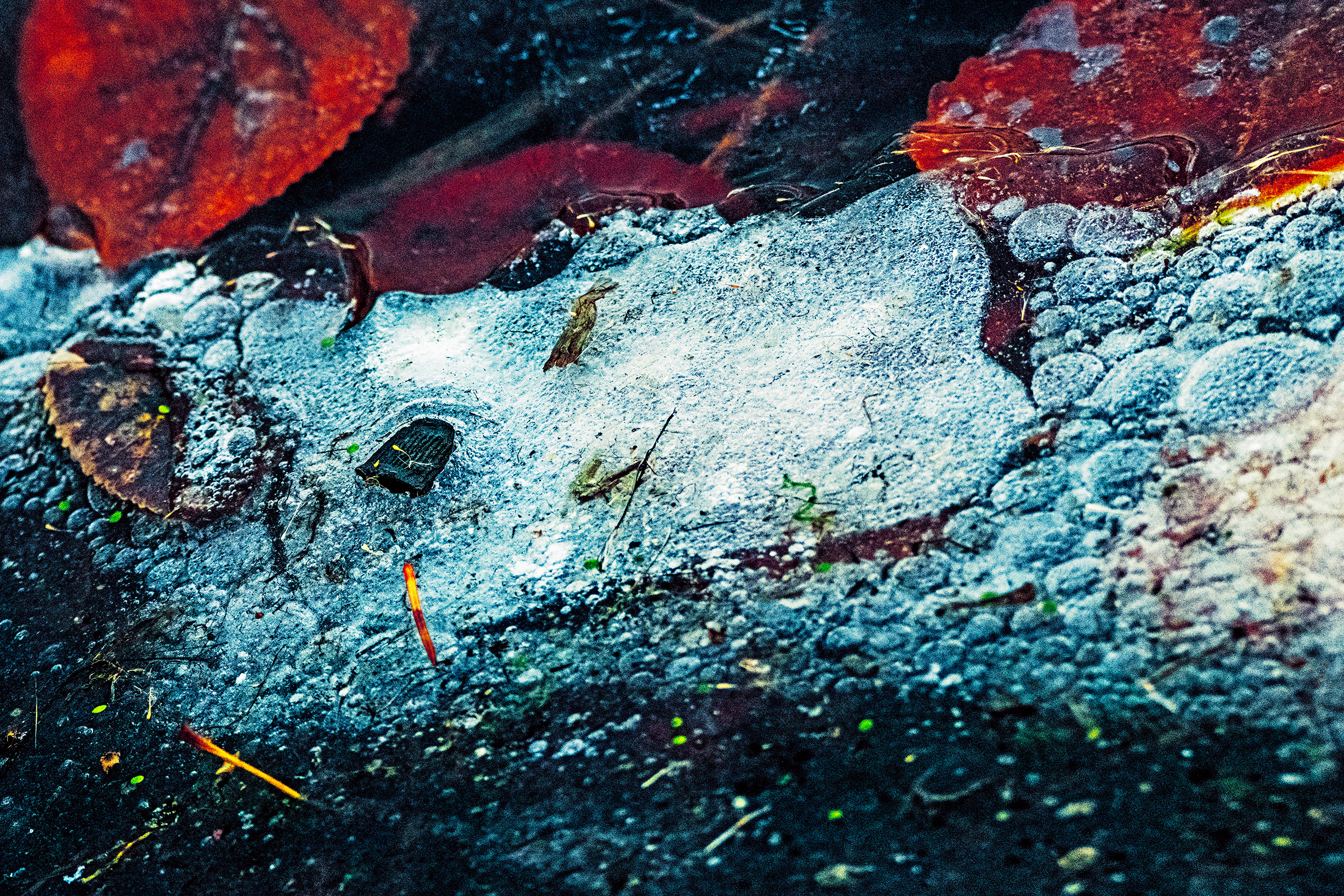 Laramie Greenbelt Trail frozen rubber eyed ice face smiling among floating leaves telephoto shot captured outdoors on November 27th 2025 at 9:34 AM during a cold, cloudy and windy autumn morning by Laramie Wyoming photographer Sean Michael Datz using a Nikon D850 camera with Sigma TC-2001 2x Teleconverter and Sigma 150-600mm telephoto lens at a focal length distance of 480mm.