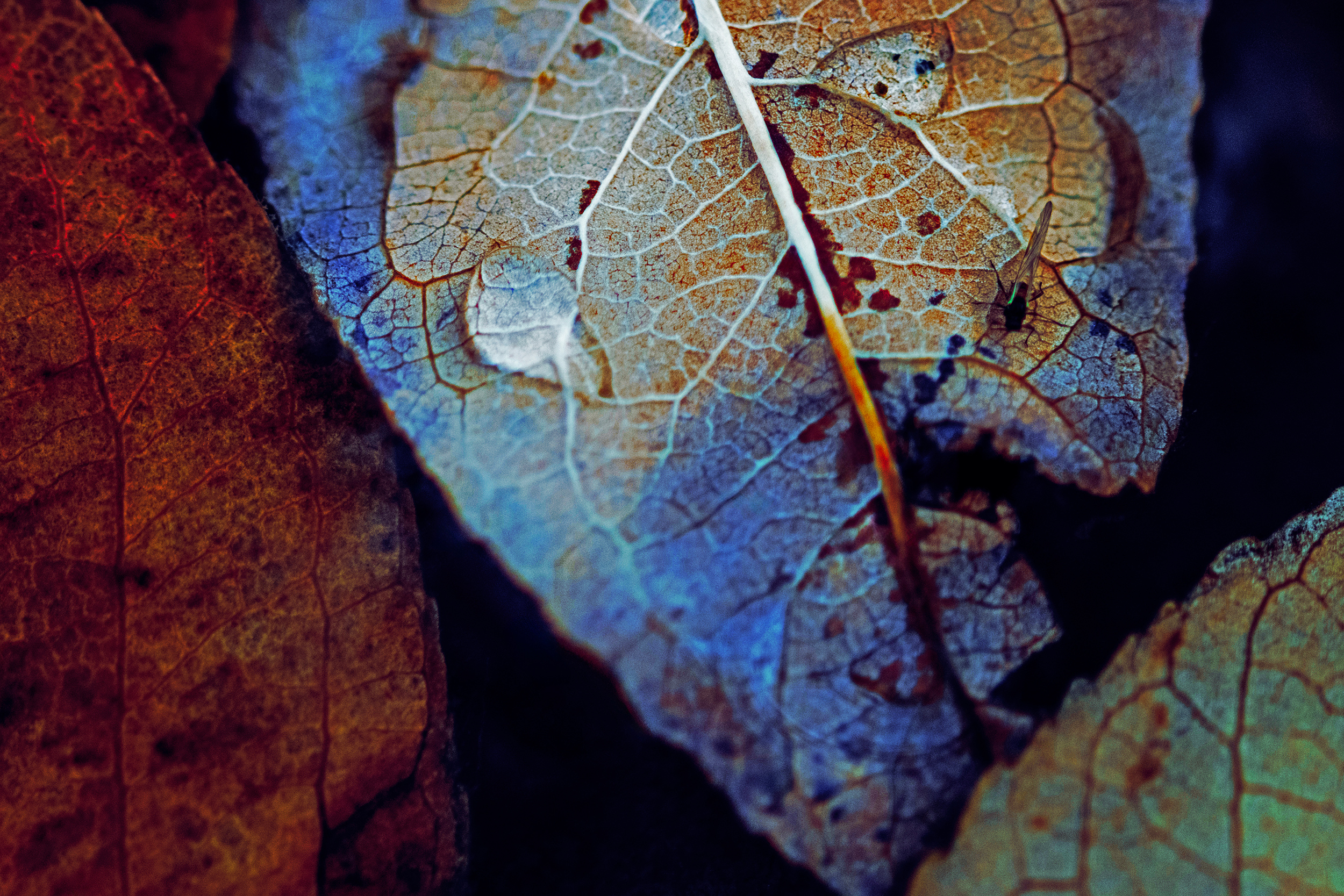 Laramie Greenbelt Trail dewy eyed leaf face cringing towards bug macro shot captured outdoors on October 24th 2024 at 11:30 AM during a cool, cloudy and windy autumn morning by Laramie Wyoming photographer Sean Michael Datz using a Nikon D850 camera with Sigma TC-2001 2x Teleconverter and Sigma 105mm macro lens at a focal length distance of 210mm.