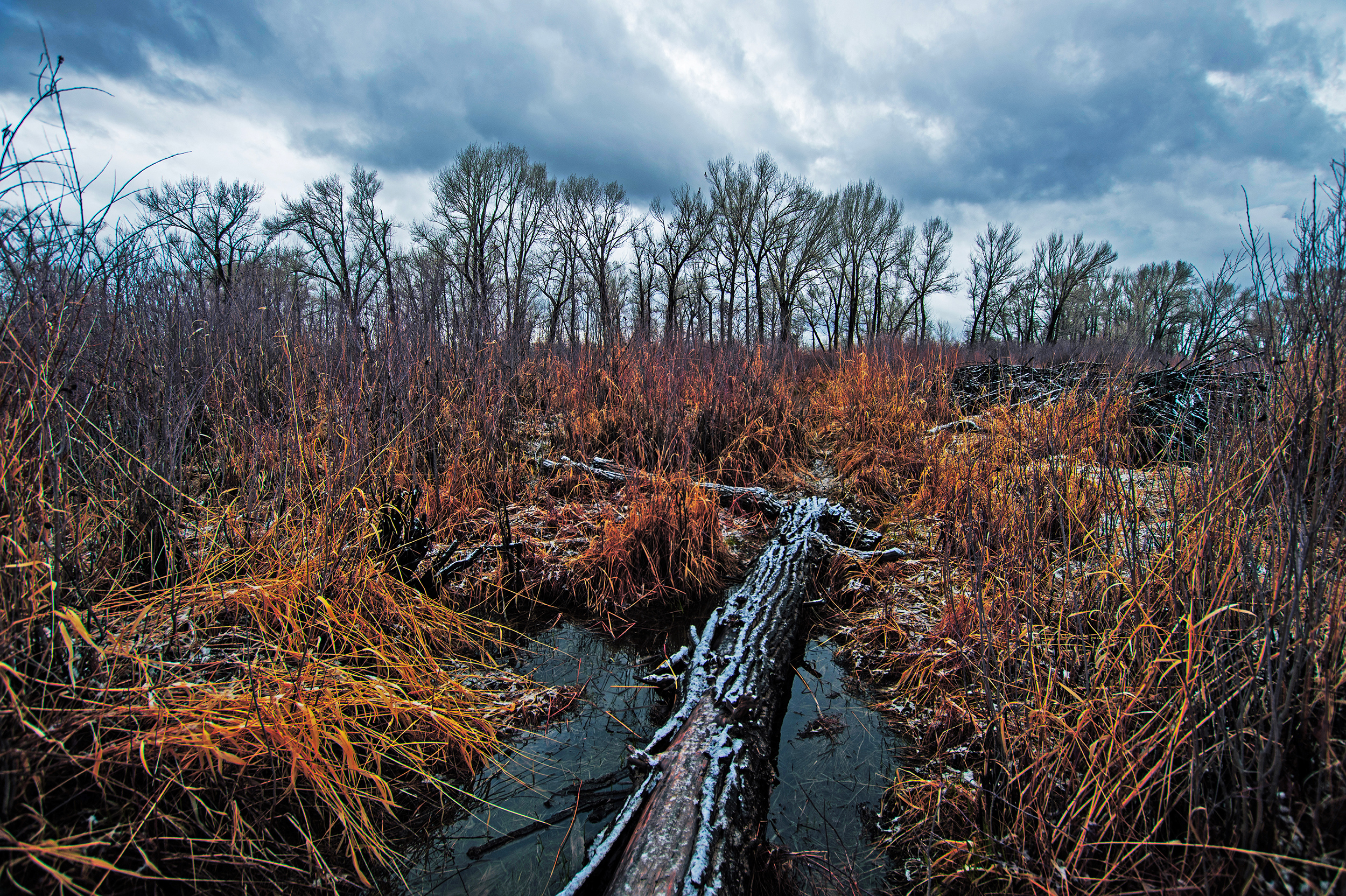 Laramie Greenbelt Trail fallen snow covered tree log among reed grass wide angle shot captured outdoors on April 27th 2024 at 8:23 AM during a cold, cloudy, overcast, snowy and windy spring morning by Laramie Wyoming photographer Sean Michael Datz using a Nikon D850 camera and Sigma 10-20mm wide angle lens at a focal length distance of 10mm.