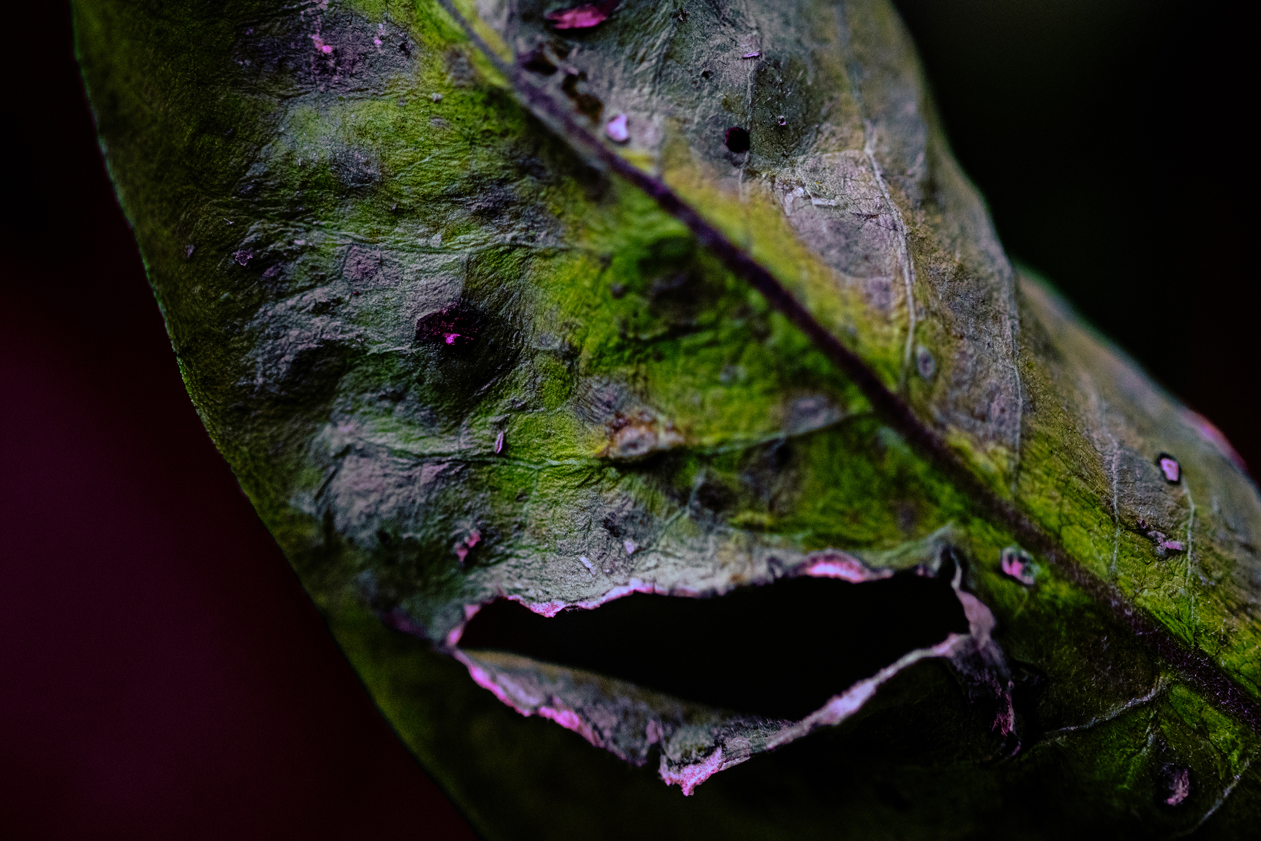 Laramie Greenbelt Trail lacerated mouth leaf face smirking among decay macro shot captured outdoors on September 21st 2024 at 7:50 AM during a cool and unknown autumn morning by Laramie Wyoming photographer Sean Michael Datz using a Nikon D850 camera with Sigma TC-2001 2x Teleconverter and Sigma 105mm macro lens at a focal length distance of 210mm.