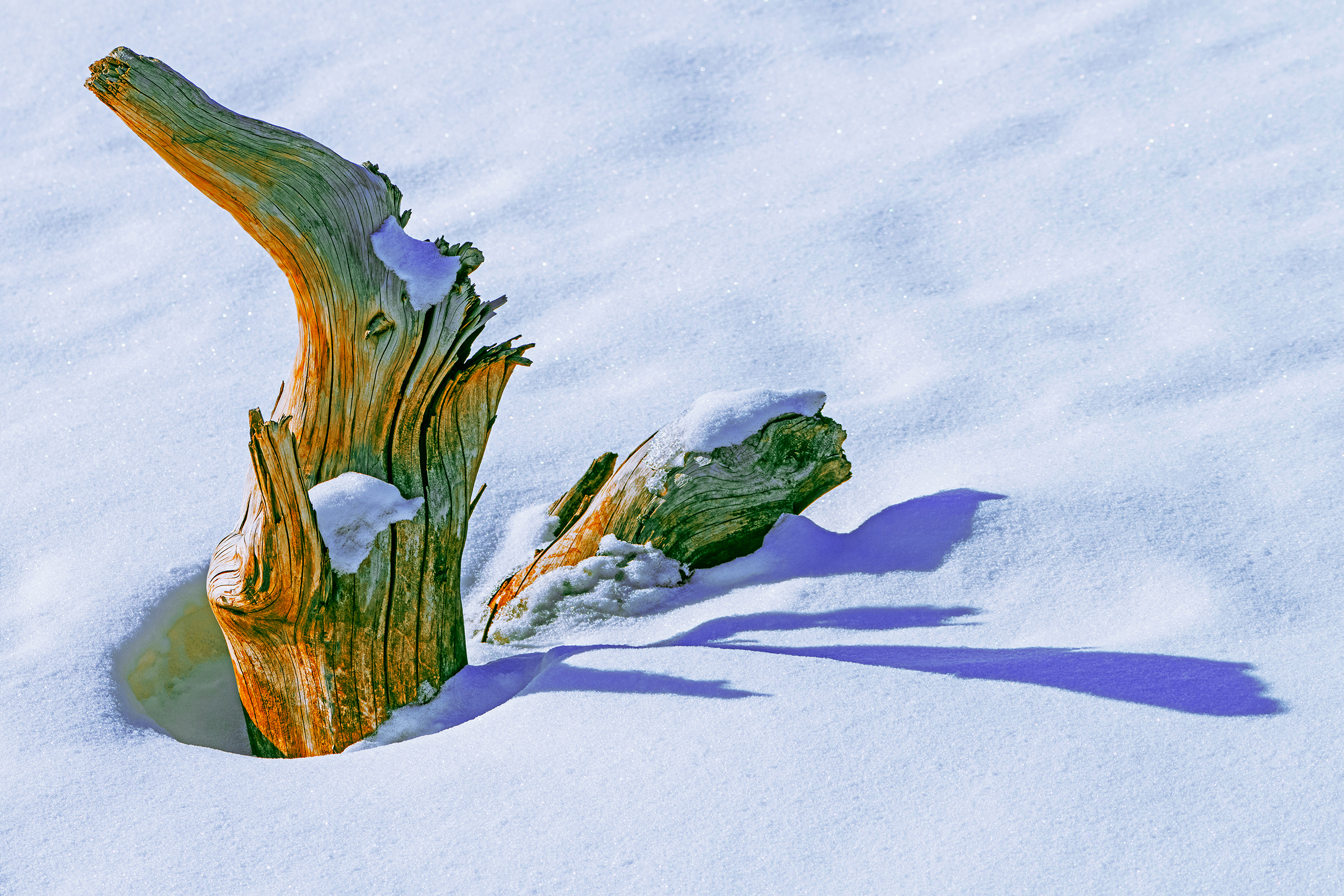 Laramie Greenbelt Trail shadow casting tree trunk waving among snow macro shot captured outdoors on January 26th 2025 at 1:52 PM during a cold, cloudy, sunny and windy winter afternoon by Laramie Wyoming photographer Sean Michael Datz using a Nikon D850 camera with Sigma TC-2001 2x Teleconverter and Sigma 105mm macro lens at a focal length distance of 210mm.