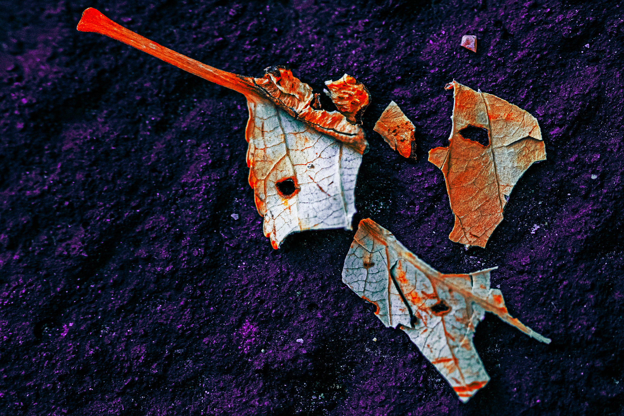 Shattered Leaf Face Separating Atop Pavement (Purple Tint)