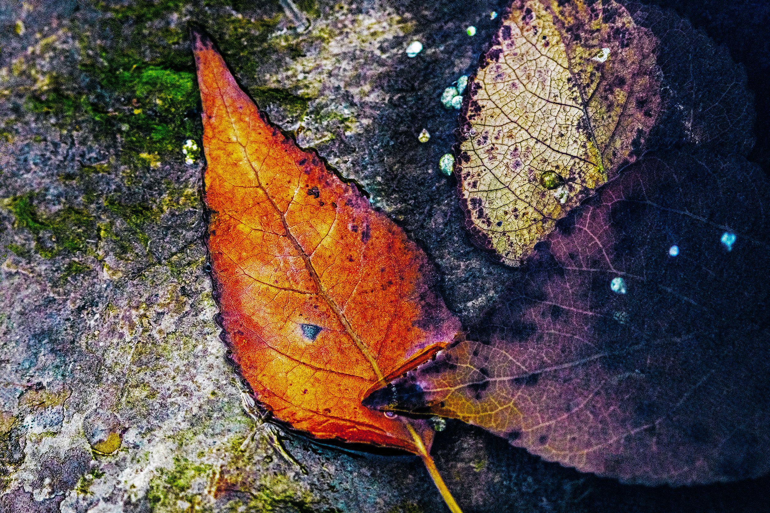 LaBonte Park soggy cannibal leaf face chewing another leaf macro shot captured outdoors on October 27th 2024 at 9:03 AM during a cool and cloudy autumn morning by Laramie Wyoming photographer Sean Michael Datz using a Nikon D850 camera with Sigma TC-2001 2x Teleconverter and Sigma 105mm macro lens at a focal length distance of 210mm.