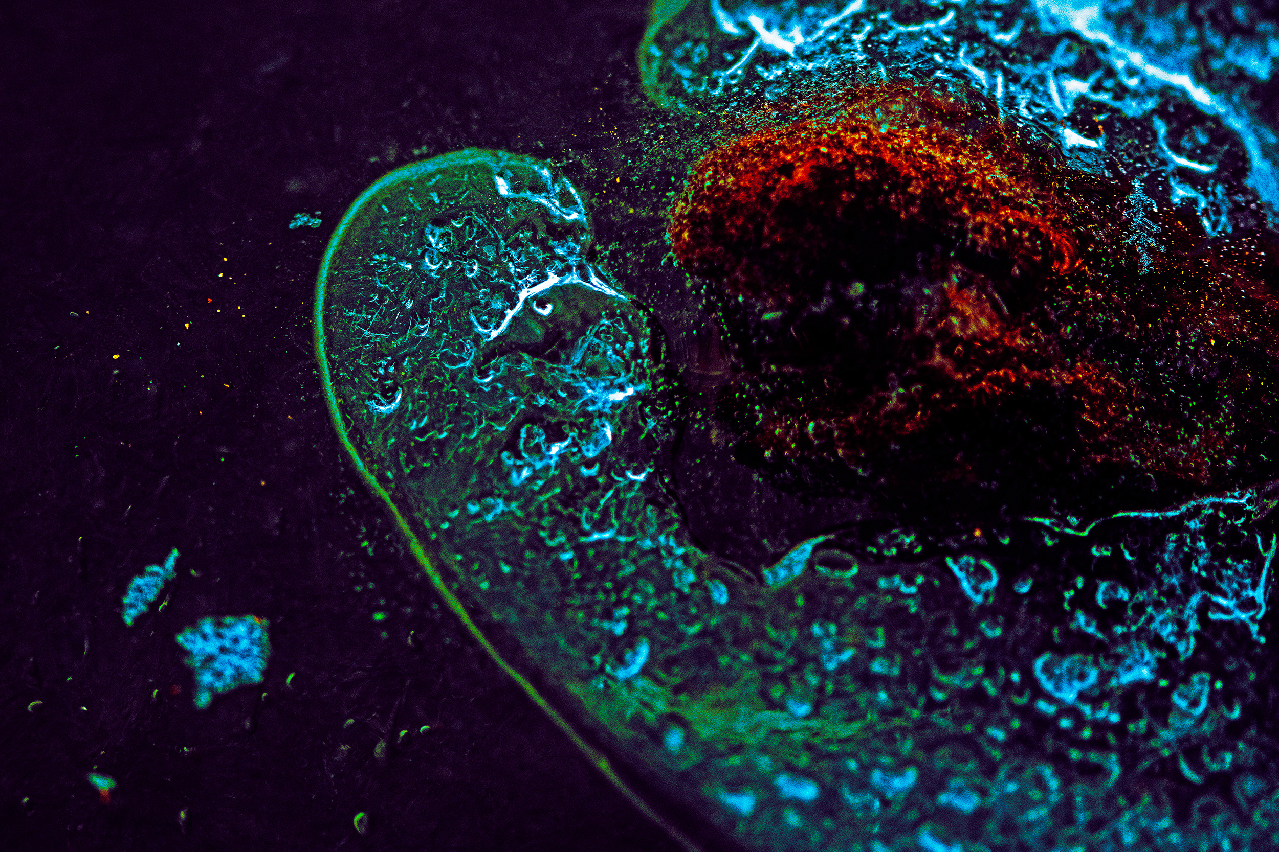Laramie Greenbelt Trail angry eyebrow raised ice bubble creature bending beside mossy rock macro shot captured outdoors on November 30th 2025 at 9:30 AM during a cold, cloudy and windy autumn morning by Laramie Wyoming photographer Sean Michael Datz using a Nikon D850 camera with Sigma TC-2001 2x Teleconverter and Sigma 105mm macro lens at a focal length distance of 210mm.
