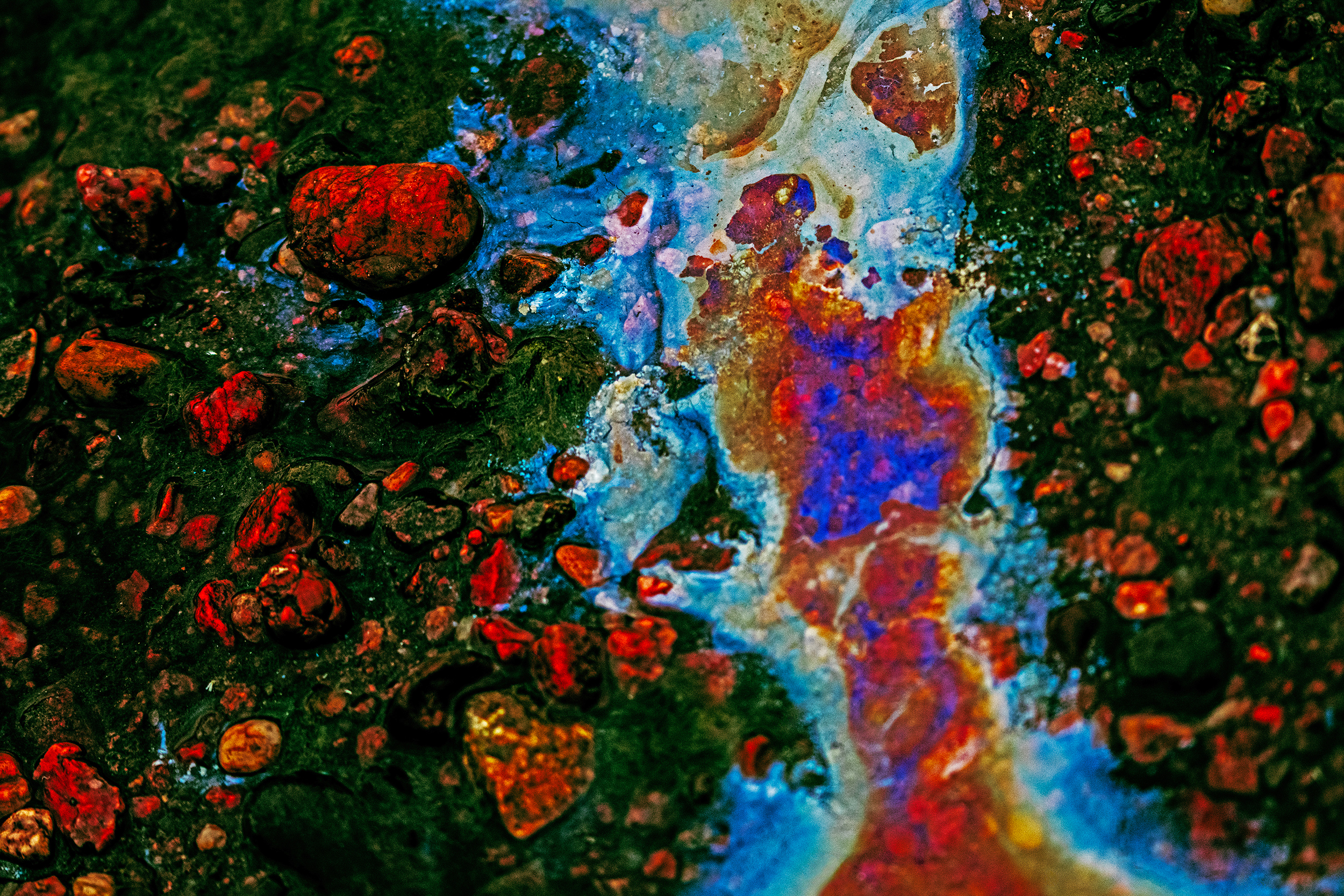 Laramie Greenbelt Trail distorted oil face smearing among rocky shore macro shot captured outdoors on July 17th 2024 at 6:44 AM during a warm, cloudy and sunny summer morning by Laramie Wyoming photographer Sean Michael Datz using a Nikon D850 camera with Sigma TC-2001 2x Teleconverter and Sigma 105mm macro lens at a focal length distance of 210mm.