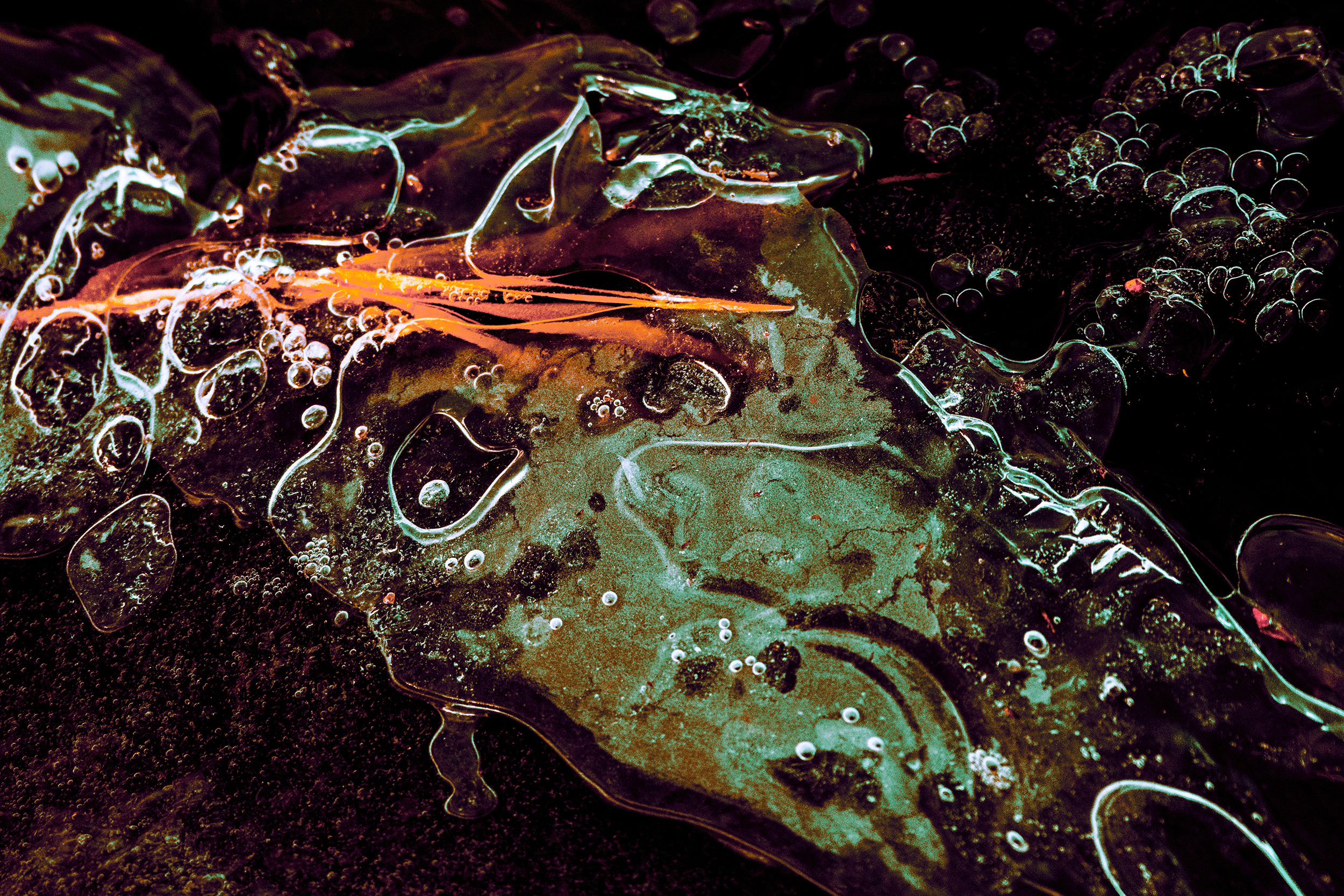 Laramie Greenbelt Trail frozen shapeshifting pupil bubble eyed ice face macro shot captured outdoors on December 12th 2025 at 9:13 AM during a cold, cloudy and windy winter morning by Laramie Wyoming photographer Sean Michael Datz using a Nikon D850 camera with Sigma TC-2001 2x Teleconverter and Sigma 105mm macro lens at a focal length distance of 210mm.