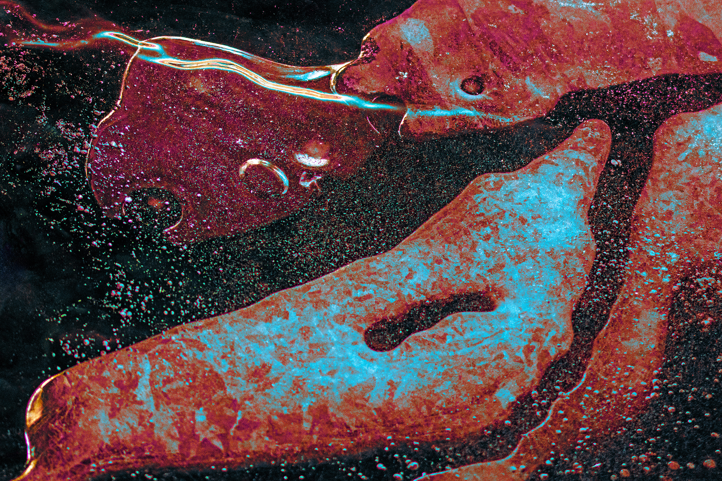 Scared River Ice Face Separating Among Frigid Water (Red Tint)