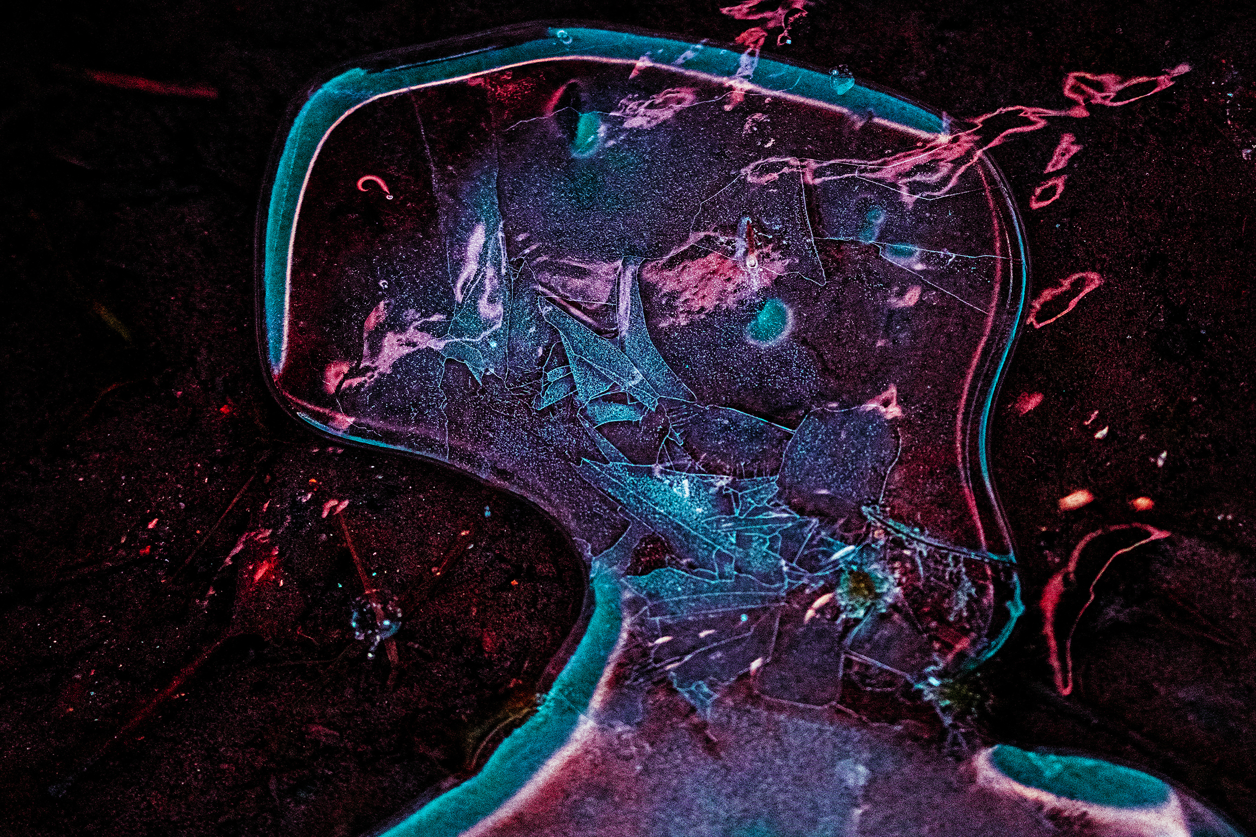 Laramie Greenbelt Trail shattering ice head cracking smile along shore macro shot captured outdoors on November 24th 2025 at 9:35 AM during a cold, cloudy and windy autumn morning by Laramie Wyoming photographer Sean Michael Datz using a Nikon D850 camera with Sigma TC-2001 2x Teleconverter and Sigma 105mm macro lens at a focal length distance of 210mm.