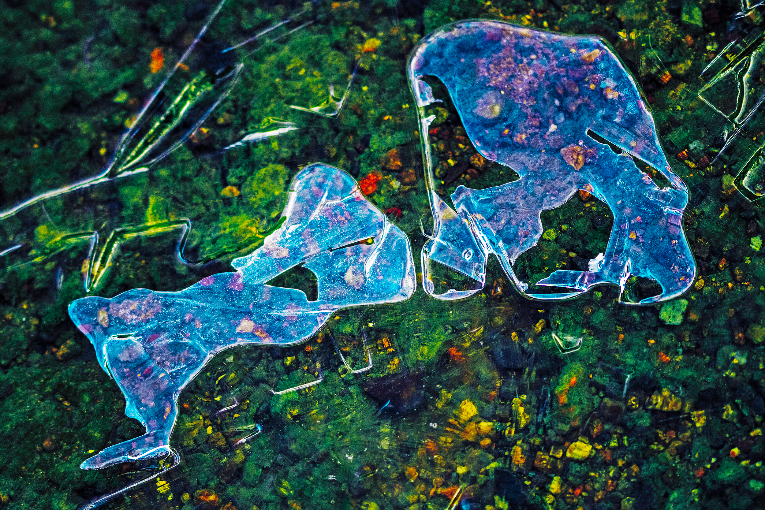 Laramie Greenbelt Trail translucent frozen big eyed alien ice bubble figure atop river macro shot captured outdoors on March 11th 2024 at 9:06 AM during a cool, cloudy and windy spring morning by Laramie Wyoming photographer Sean Michael Datz using a Nikon D850 camera with Sigma TC-2001 2x Teleconverter and Sigma 105mm macro lens at a focal length distance of 210mm.
