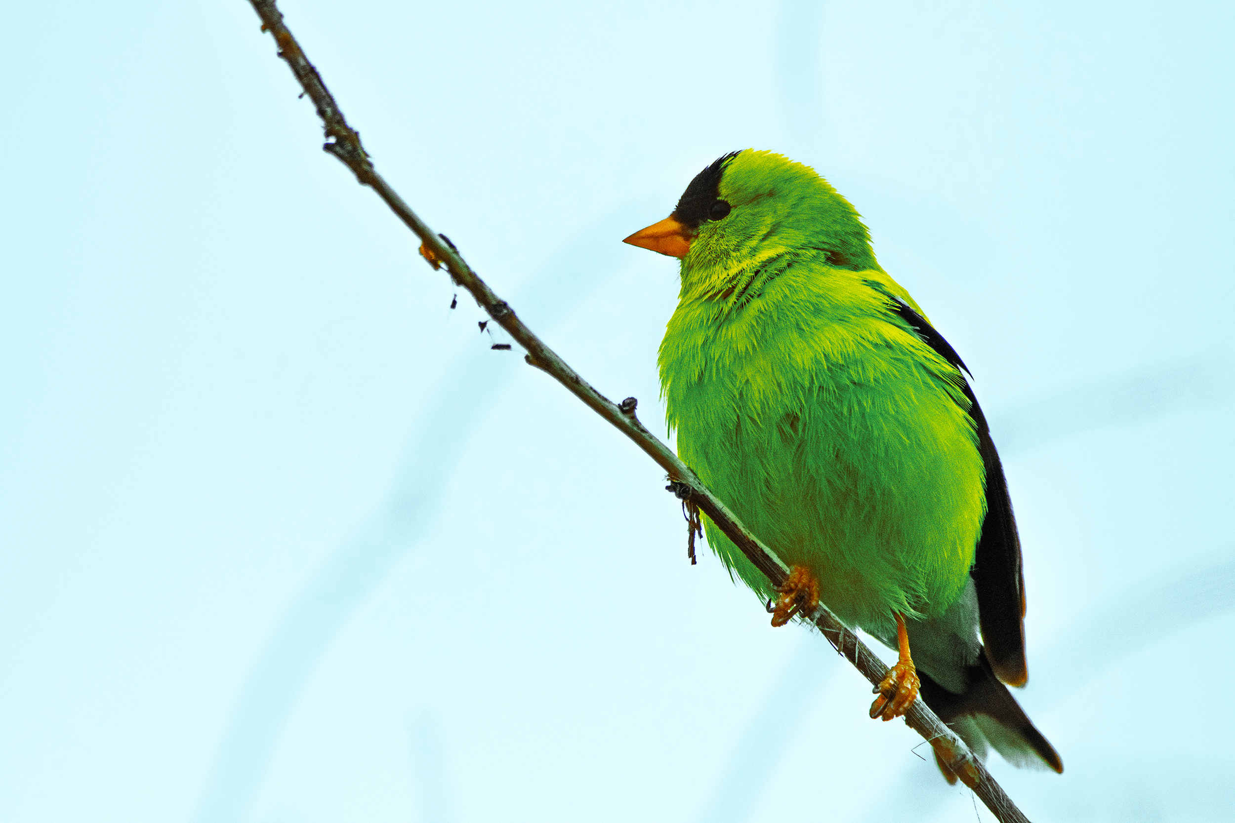 Laramie Greenbelt Trail american goldfinch perched along slanted branch telephoto shot captured outdoors on July 14th 2023 at 7:46 AM during a warm, sunny and windy summer morning by Laramie Wyoming photographer Sean Michael Datz using a Nikon D850 camera with Sigma TC-2001 2x Teleconverter and Sigma 150-600mm telephoto lens at a focal length distance of 1200mm.