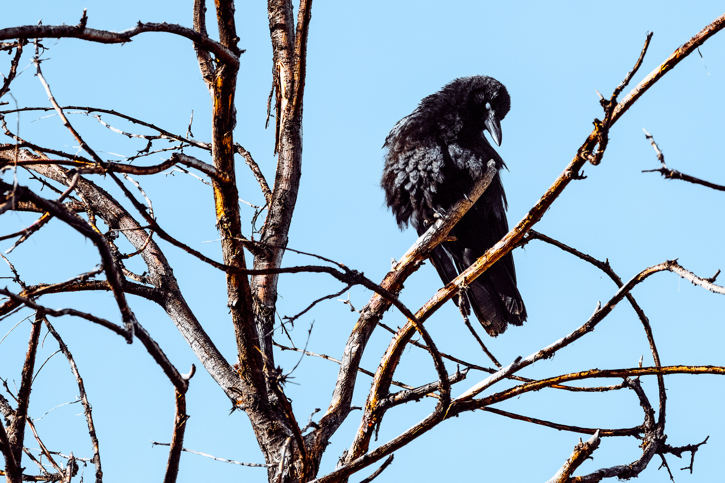 Glaze Eyed Crow Tilting Head Among Dead Tree Branches