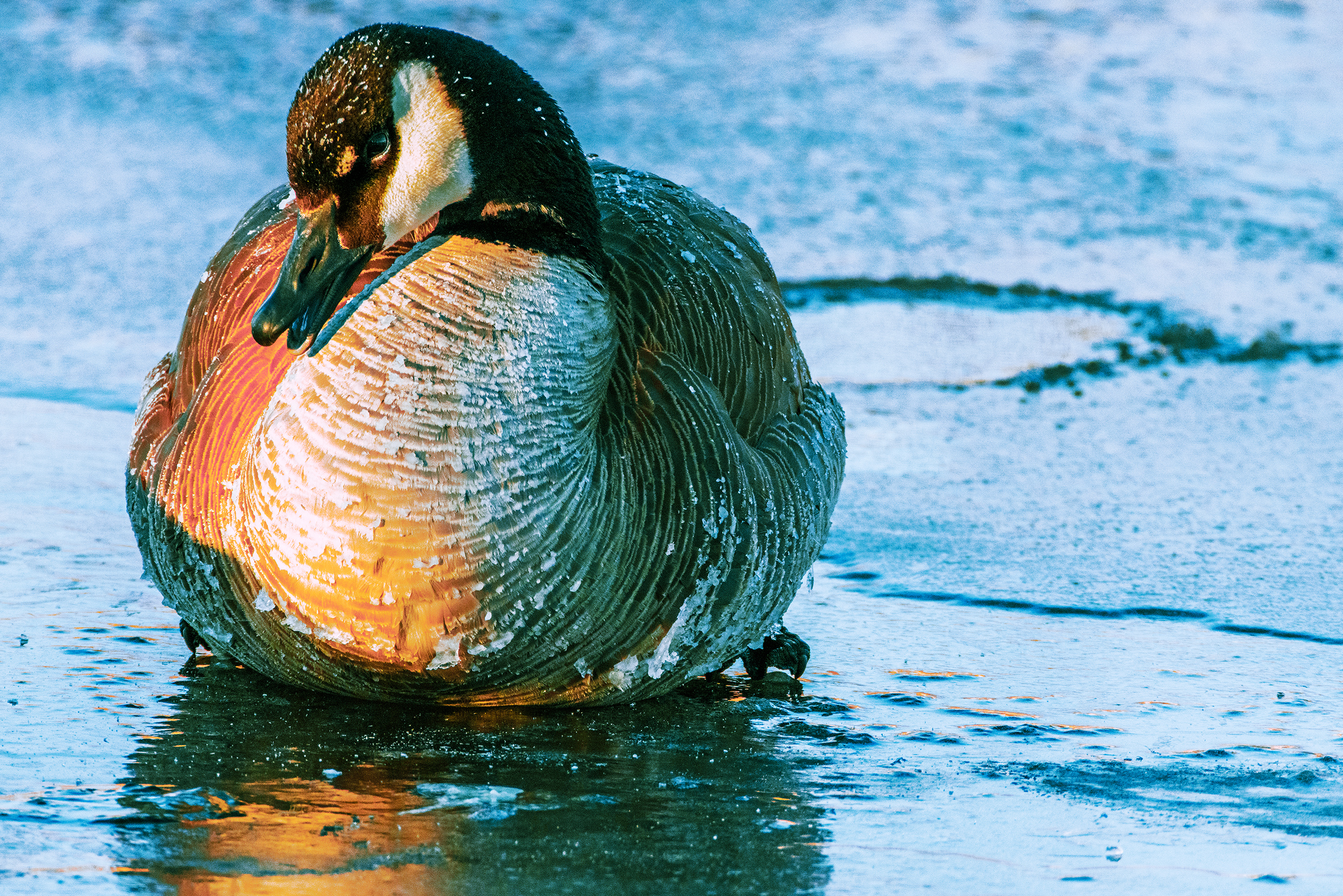Laramie Greenbelt Trail open mouthed goose laying atop ice frozen river telephoto shot captured outdoors on March 28th 2023 at 7:47 AM during a cold, sunny and windy spring morning by Laramie Wyoming photographer Sean Michael Datz using a Nikon D850 camera with Sigma TC-2001 2x Teleconverter and Sigma 150-600mm telephoto lens at a focal length distance of 750mm.