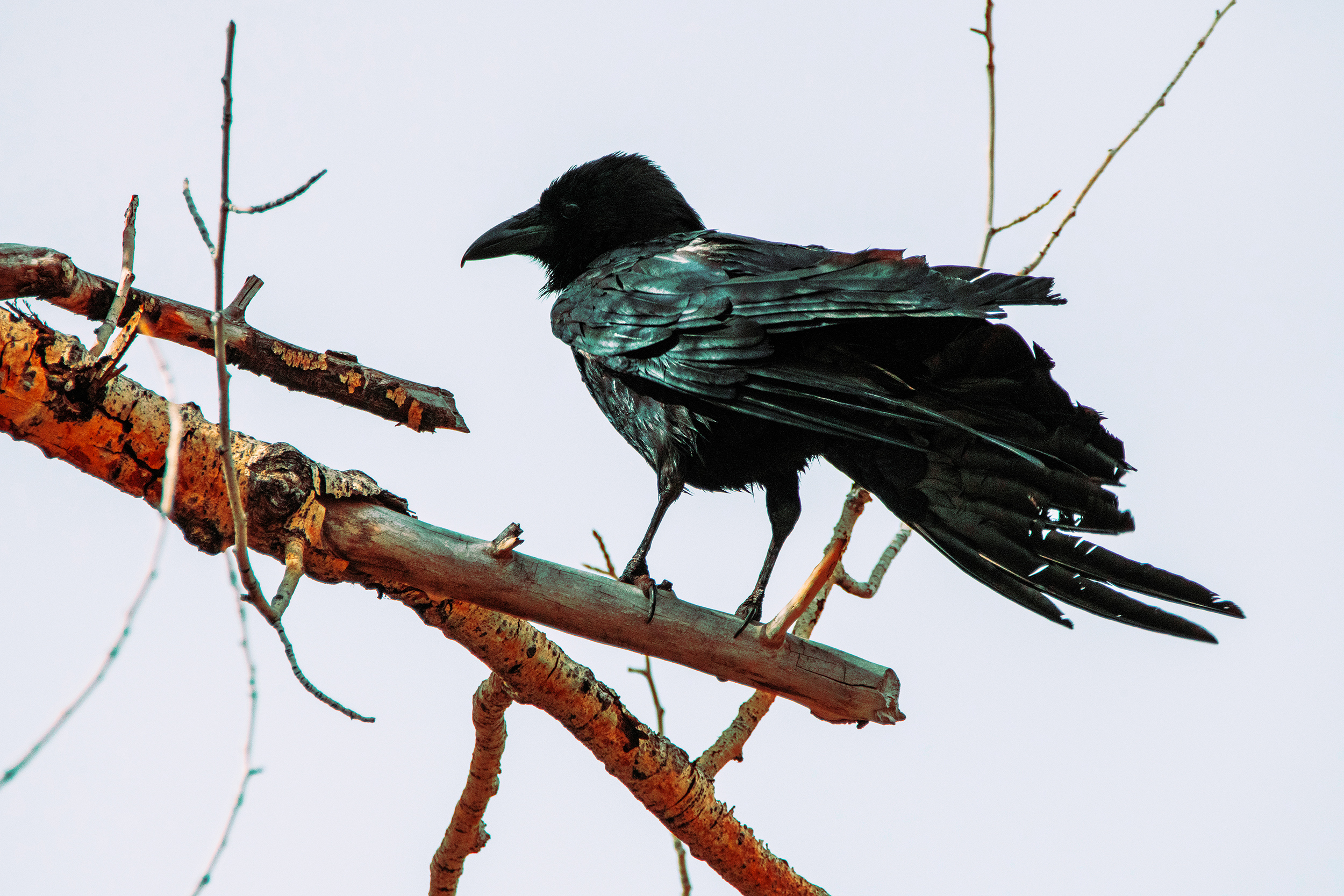 Laramie Greenbelt Trail raven grips onto broken tree branch telephoto shot captured outdoors on May 5th 2024 at 8:37 AM during a cool, cloudy and windy spring morning by Laramie Wyoming photographer Sean Michael Datz using a Nikon D850 camera with Sigma TC-2001 2x Teleconverter and Sigma 150-600mm telephoto lens at a focal length distance of 850mm.
