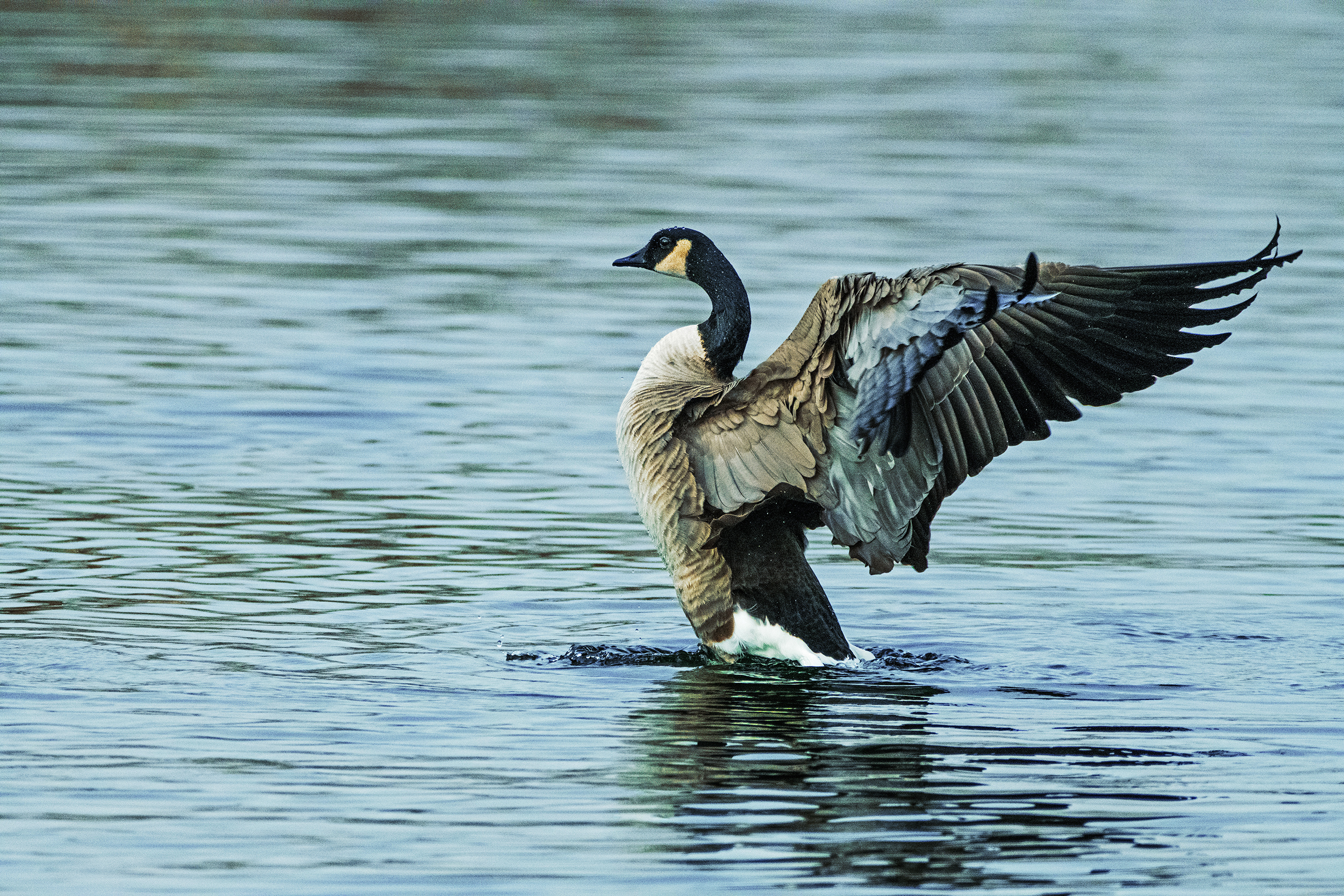 LaBonte Park rising canadian goose spreading wings among lake top telephoto shot captured outdoors on November 21st 2025 at 9:02 AM during a cold, cloudy and windy autumn morning by Laramie Wyoming photographer Sean Michael Datz using a Nikon D850 camera with Sigma TC-2001 2x Teleconverter and Sigma 150-600mm telephoto lens at a focal length distance of 750mm.
