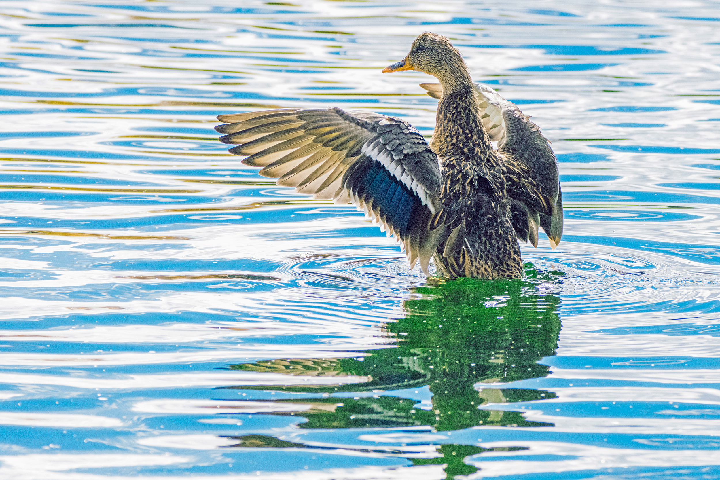 LaBonte Park rising mallard duck flaps wings atop lake telephoto shot captured outdoors on October 14th 2025 at 12:17 PM during a warm, cloudy, sunny and windy autumn afternoon by Laramie Wyoming photographer Sean Michael Datz using a Nikon D850 camera with Sigma TC-2001 2x Teleconverter and Sigma 150-600mm telephoto lens at a focal length distance of 420mm.