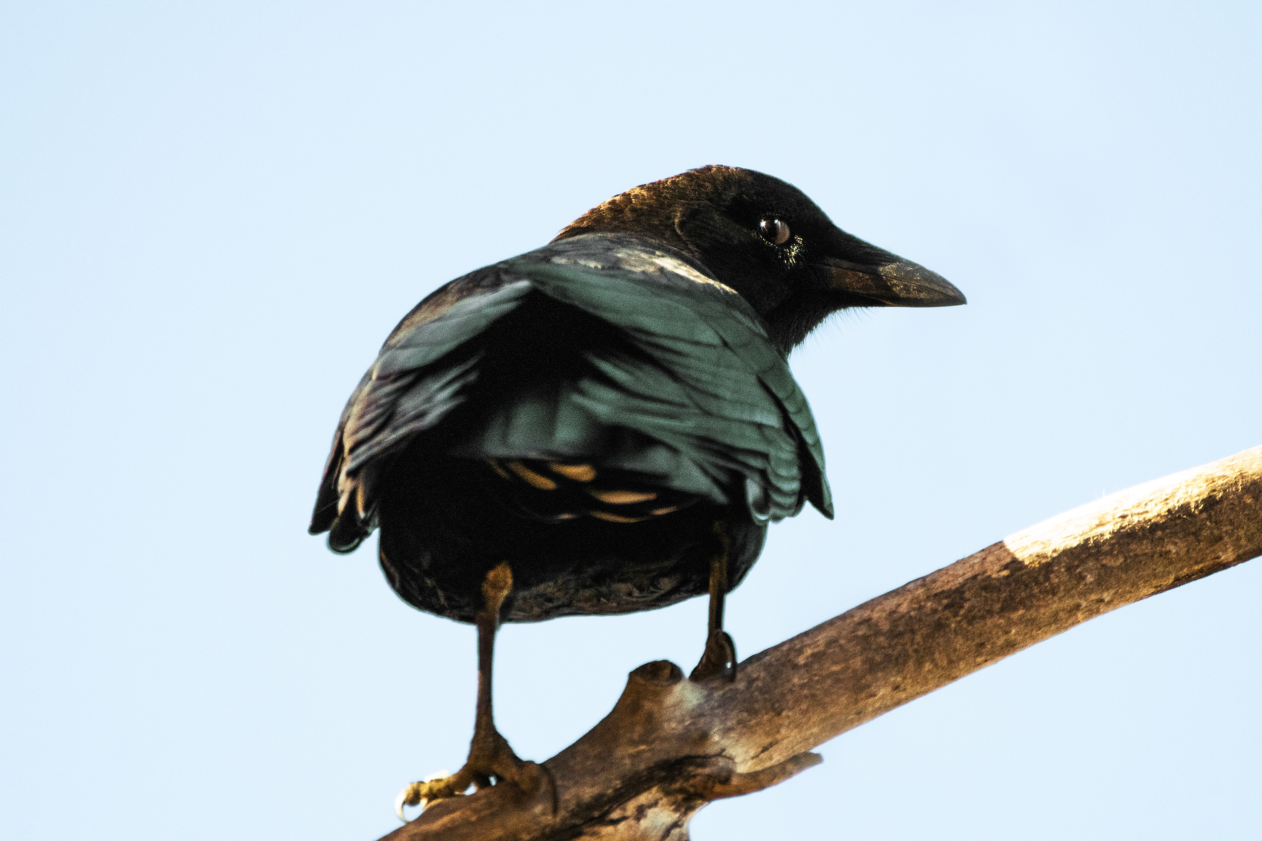 Laramie Greenbelt Trail sly eyed crow glances backward among tree branch telephoto shot captured outdoors on October 17th 2023 at 10:22 AM during a cool, sunny and windy autumn morning by Laramie Wyoming photographer Sean Michael Datz using a Nikon D850 camera with Sigma TC-2001 2x Teleconverter and Sigma 150-600mm telephoto lens at a focal length distance of 1050mm.