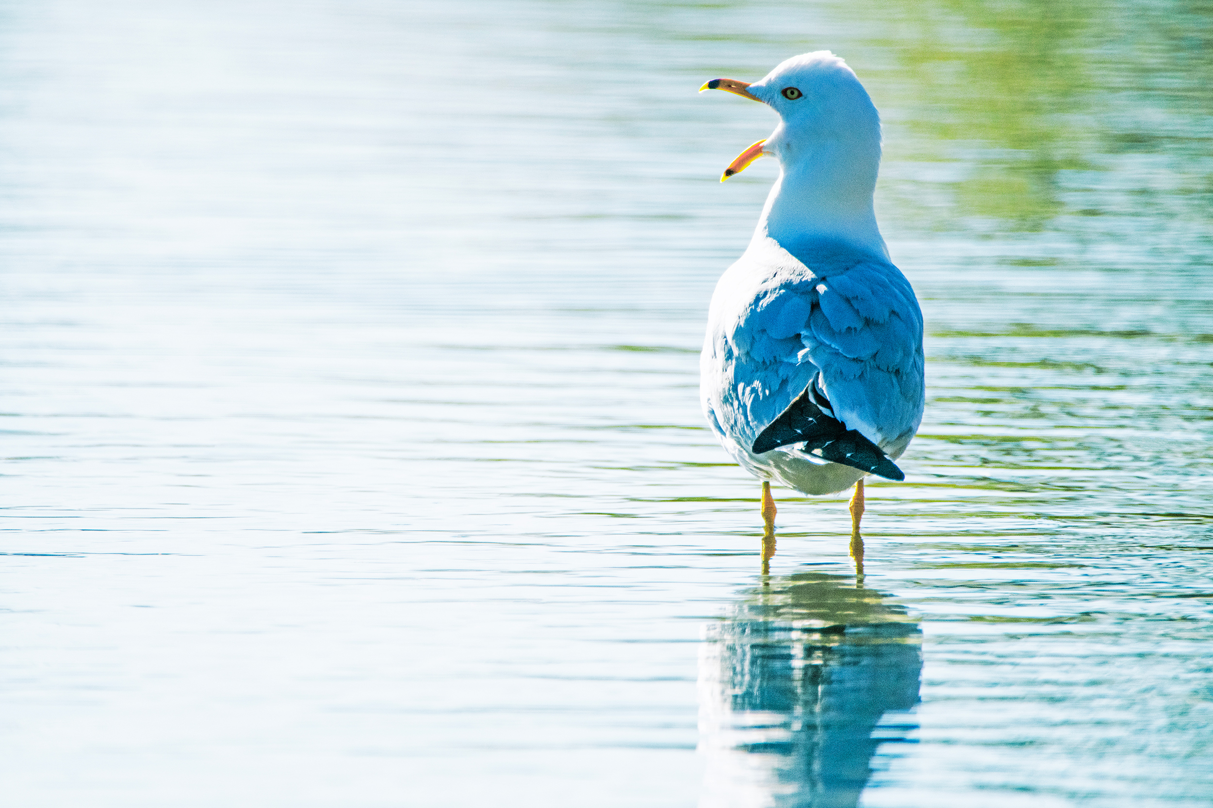 Tired Seagull Yawning Among Shallow Water