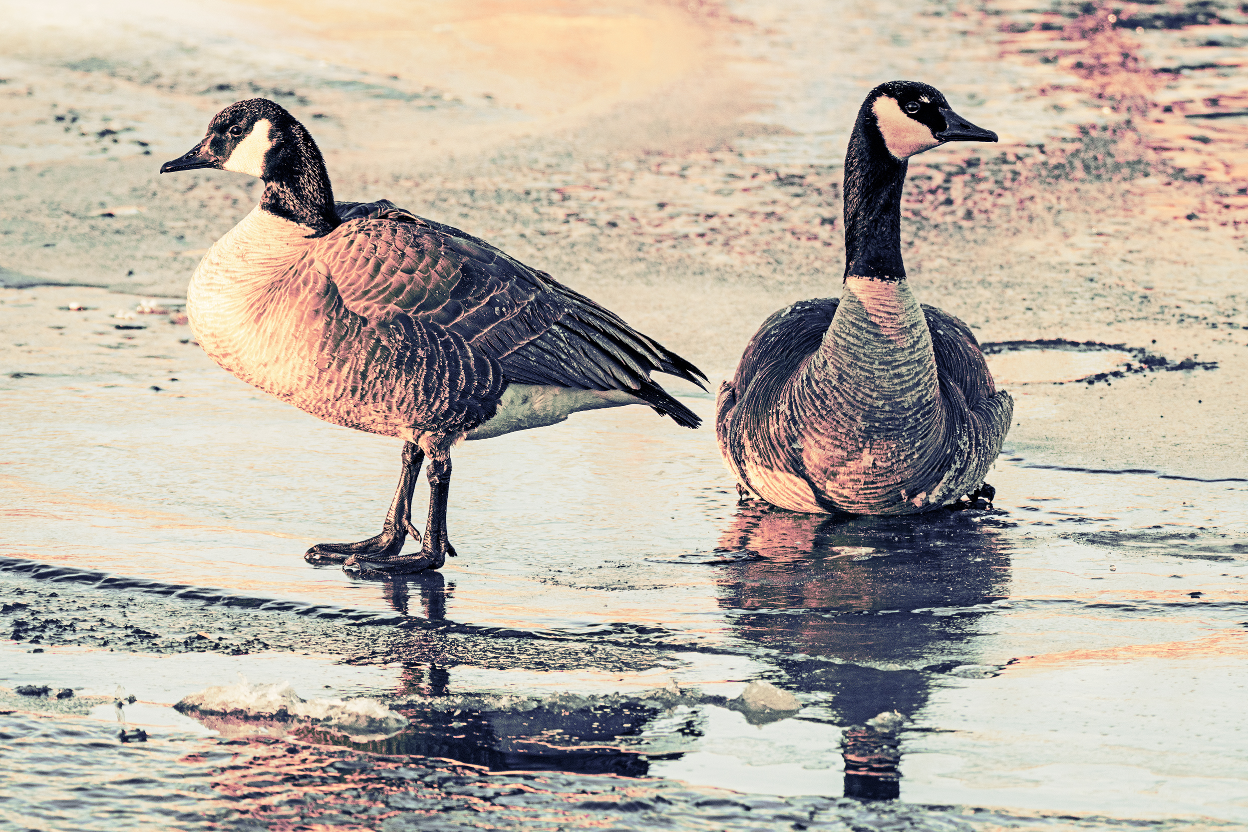 Laramie Greenbelt Trail two geese embrace sunrise atop ice frozen river telephoto shot captured outdoors on March 28th 2023 at 7:47 AM during a cold, sunny and windy spring morning by Laramie Wyoming photographer Sean Michael Datz using a Nikon D850 camera with Sigma TC-2001 2x Teleconverter and Sigma 150-600mm telephoto lens at a focal length distance of 380mm.