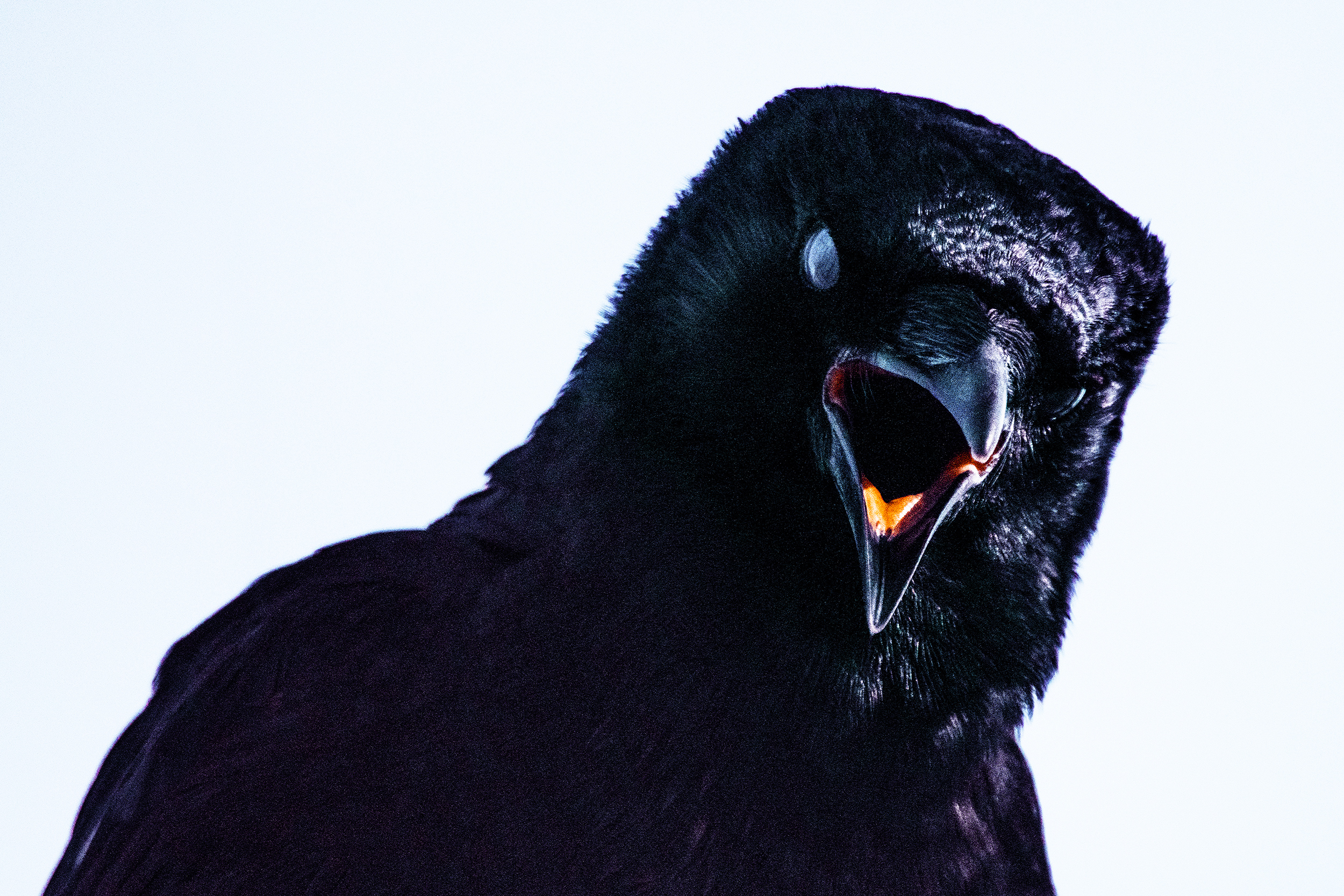 Laramie Greenbelt Trail vocal glaze eyed crow cawing down atop tree branch telephoto shot captured outdoors on November 5th 2025 at 8:59 AM during a cool, cloudy and windy autumn morning by Laramie Wyoming photographer Sean Michael Datz using a Nikon D850 camera with Sigma TC-2001 2x Teleconverter and Sigma 150-600mm telephoto lens at a focal length distance of 1200mm.