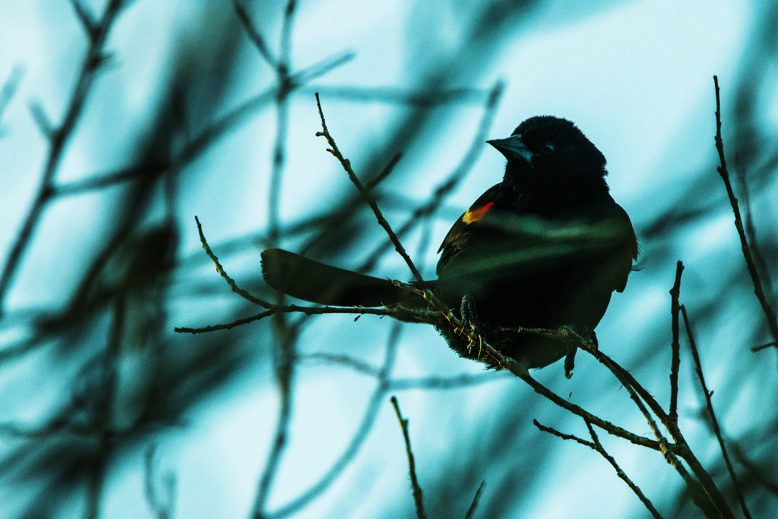 Laramie Greenbelt Trail wind gust blows red winged blackbird atop tree branch telephoto shot captured outdoors on June 22nd 2023 at 6:07 AM during a cool, cloudy and windy summer morning by Laramie Wyoming photographer Sean Michael Datz using a Nikon D850 camera with Sigma TC-2001 2x Teleconverter and Sigma 150-600mm telephoto lens at a focal length distance of 750mm.
