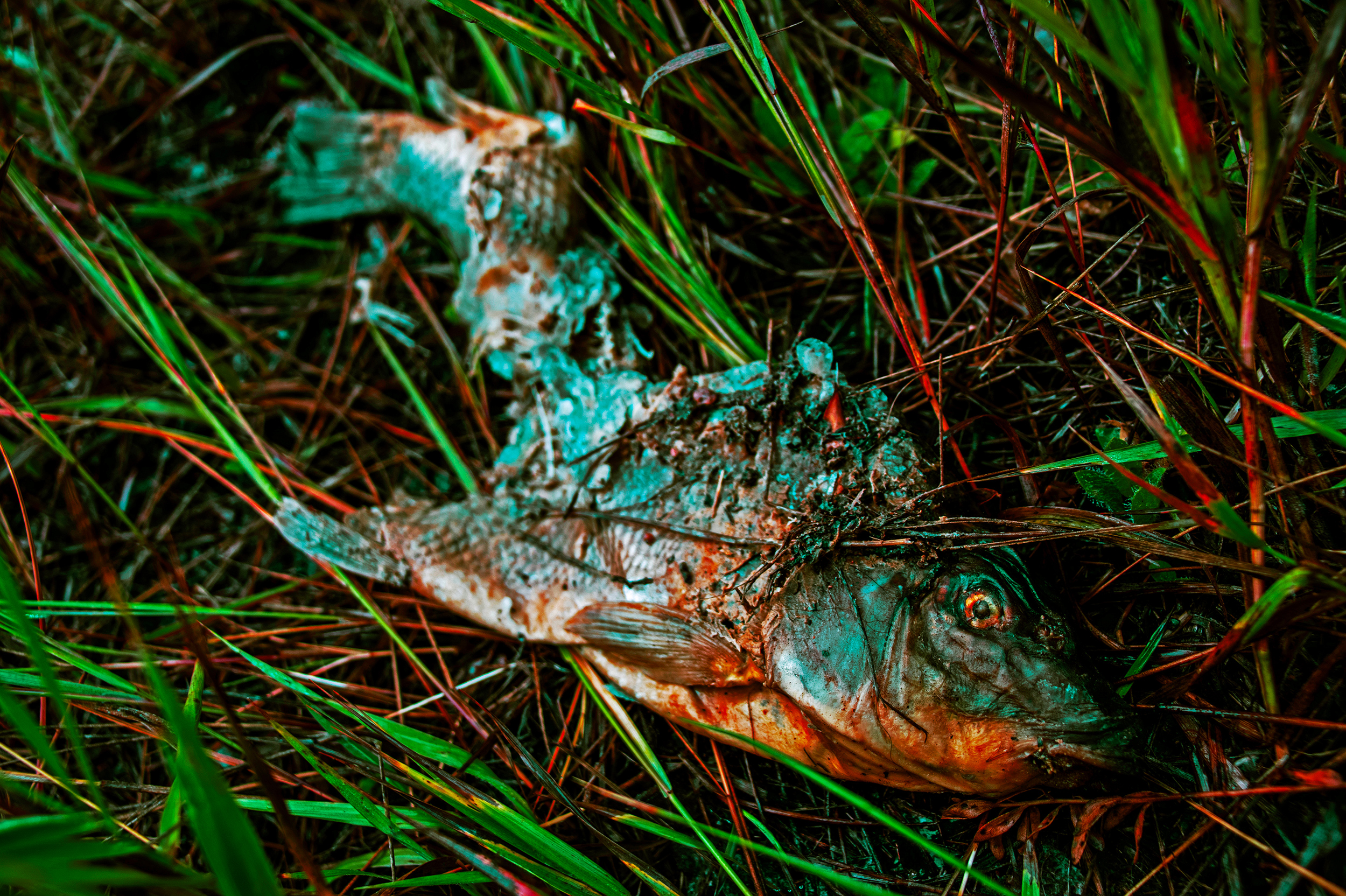 Laramie Greenbelt Trail decaying salmon fish rotting among grass wide angle shot captured outdoors on August 28th 2023 at 7:20 AM during a cool, foggy, overcast and rainy summer morning by Laramie Wyoming photographer Sean Michael Datz using a Nikon D850 camera and Sigma 18-300mm wide angle lens at a focal length distance of 28mm.