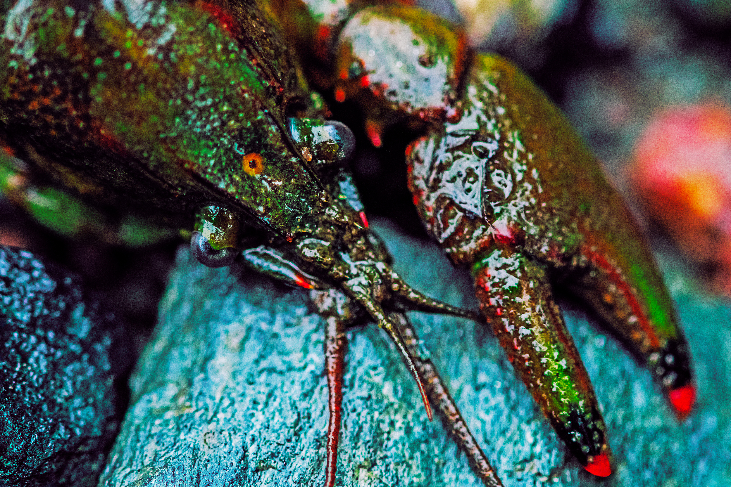 Laramie Greenbelt Trail slimy crayfish rests claw beside head macro shot captured outdoors on August 2nd 2023 at 8:24 AM during a warm and cloudy summer morning by Laramie Wyoming photographer Sean Michael Datz using a Nikon D850 camera with Sigma TC-2001 2x Teleconverter and Sigma 105mm macro lens at a focal length distance of 210mm.