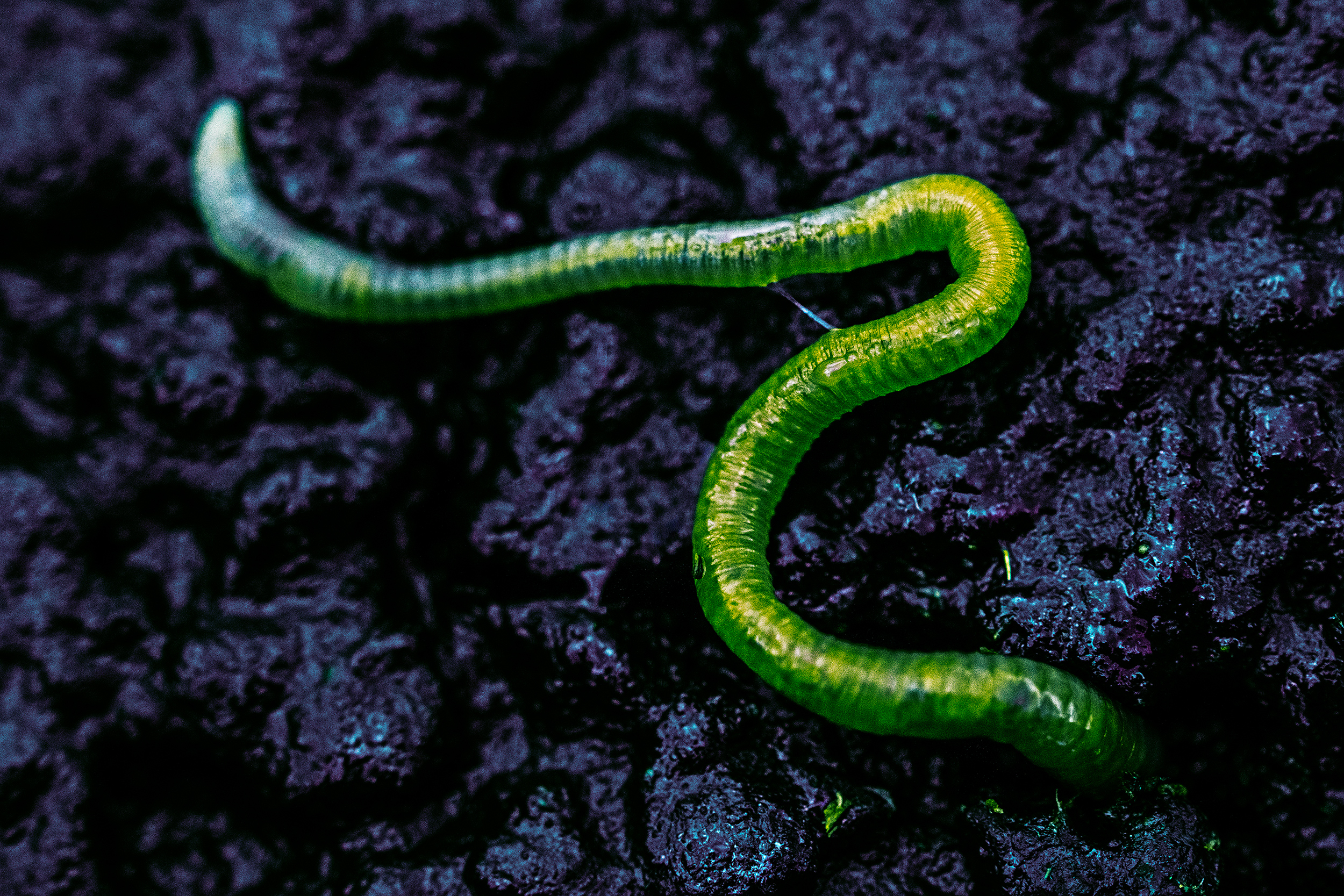 Laramie Greenbelt Trail slimy earthworm stuck between damp pavement crevice macro shot captured outdoors on August 16th 2024 at 7:21 AM during a warm, cloudy, rainy and windy summer morning by Laramie Wyoming photographer Sean Michael Datz using a Nikon D850 camera with Sigma TC-2001 2x Teleconverter and Sigma 105mm macro lens at a focal length distance of 210mm.