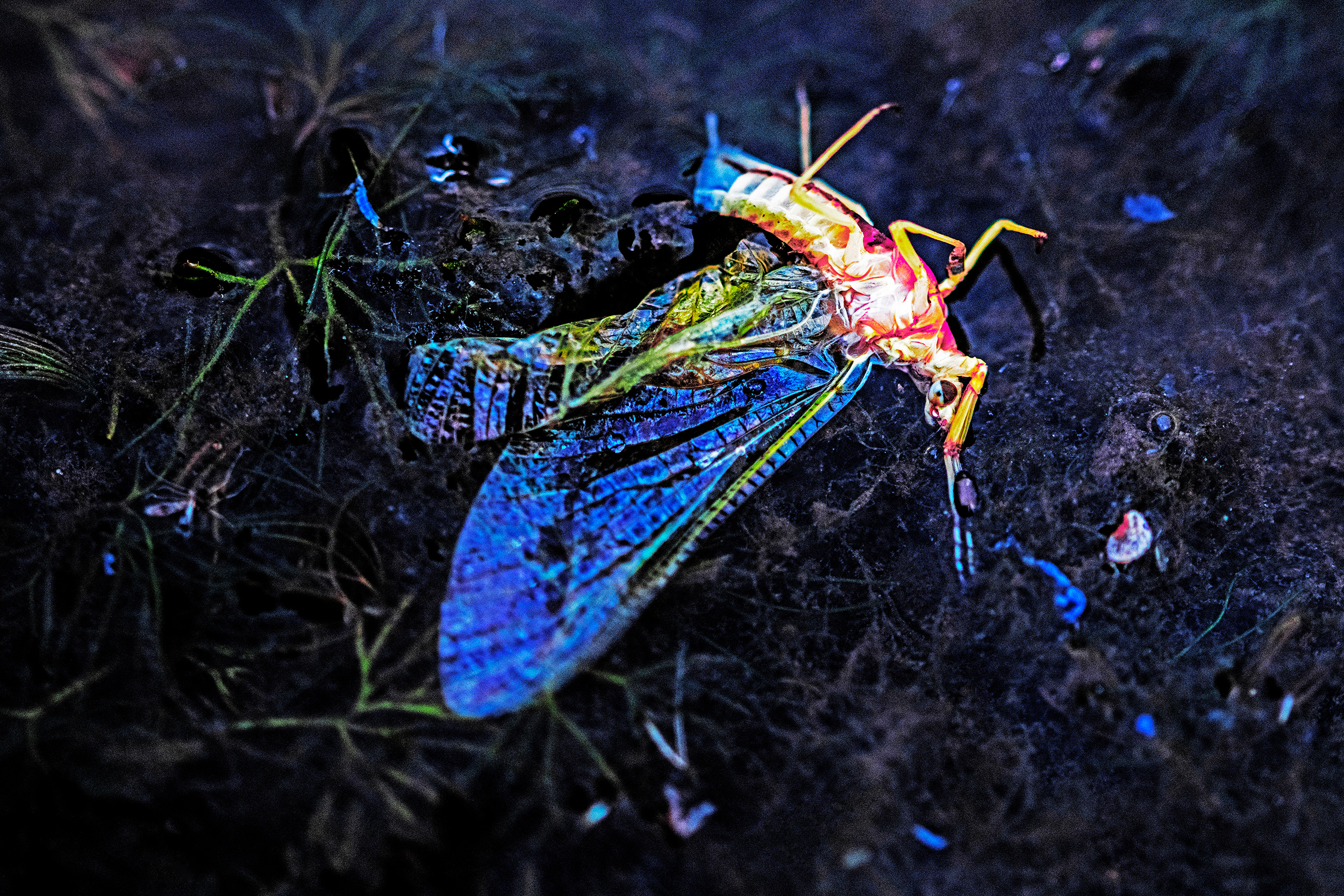Laramie Greenbelt Trail dead mayfly rests among shallow shore macro shot captured outdoors on July 29th 2025 at 8:13 AM during a warm, cloudy and sunny summer morning by Laramie Wyoming photographer Sean Michael Datz using a Nikon D850 camera with Sigma TC-2001 2x Teleconverter and Sigma 105mm macro lens at a focal length distance of 210mm.