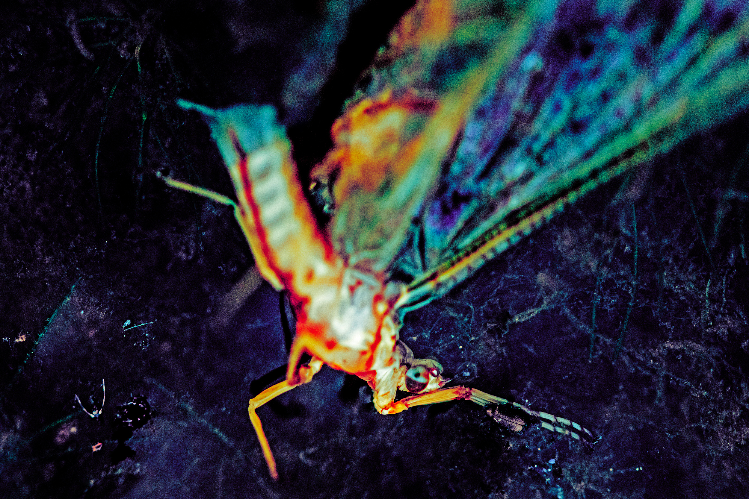 Laramie Greenbelt Trail deceased mayfly floating atop shallow river shore macro shot captured outdoors on July 29th 2025 at 8:13 AM during a warm, cloudy and sunny summer morning by Laramie Wyoming photographer Sean Michael Datz using a Nikon D850 camera with Sigma TC-2001 2x Teleconverter and Sigma 105mm macro lens at a focal length distance of 210mm.