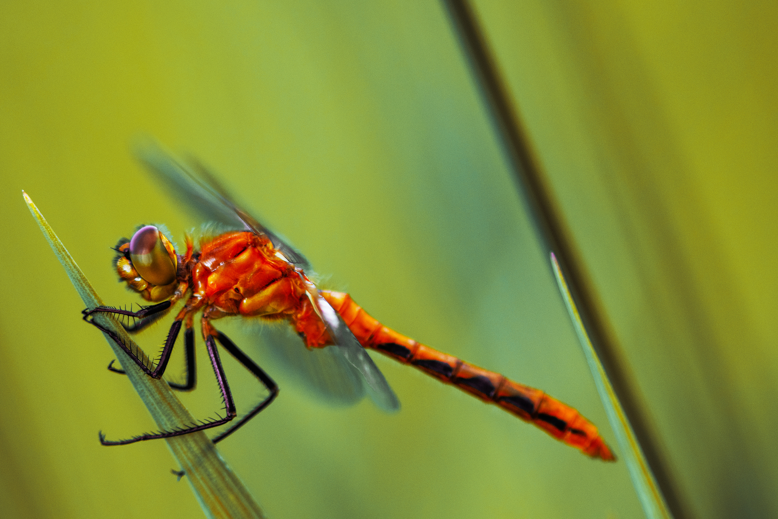 Laramie Greenbelt Trail dragonfly perched atop sloping grass blade macro shot captured outdoors on July 8th 2023 at 6:19 PM during a warm, cloudy and windy summer evening by Laramie Wyoming photographer Sean Michael Datz using a Nikon D850 camera with Sigma TC-2001 2x Teleconverter and Sigma 105mm macro lens at a focal length distance of 210mm.