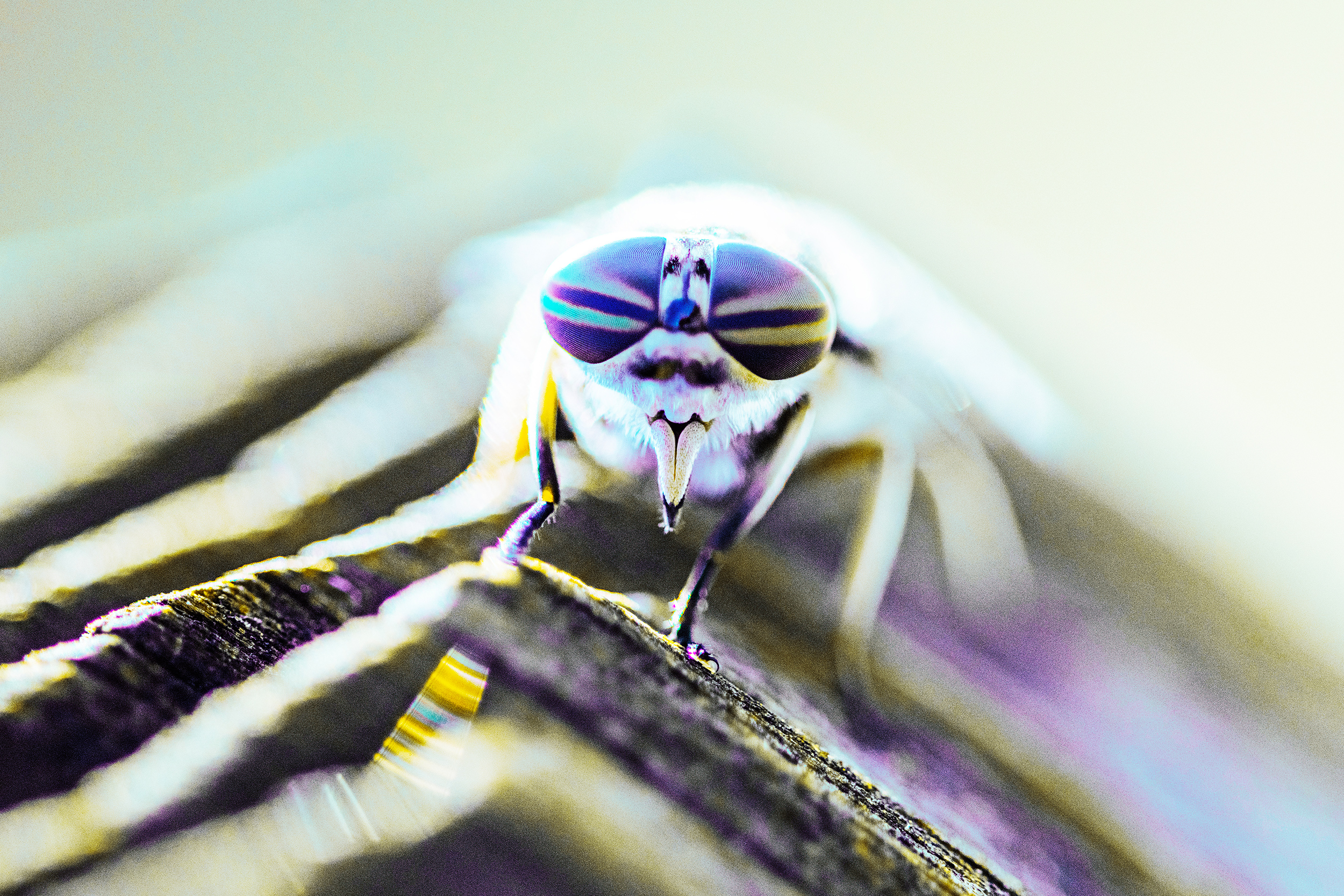 Laramie Greenbelt Trail horse fly perched along sloping wood macro shot captured outdoors on July 18th 2025 at 7:57 AM during a warm, cloudy and sunny summer morning by Laramie Wyoming photographer Sean Michael Datz using a Nikon D850 camera with Sigma TC-2001 2x Teleconverter and Sigma 105mm macro lens at a focal length distance of 210mm.