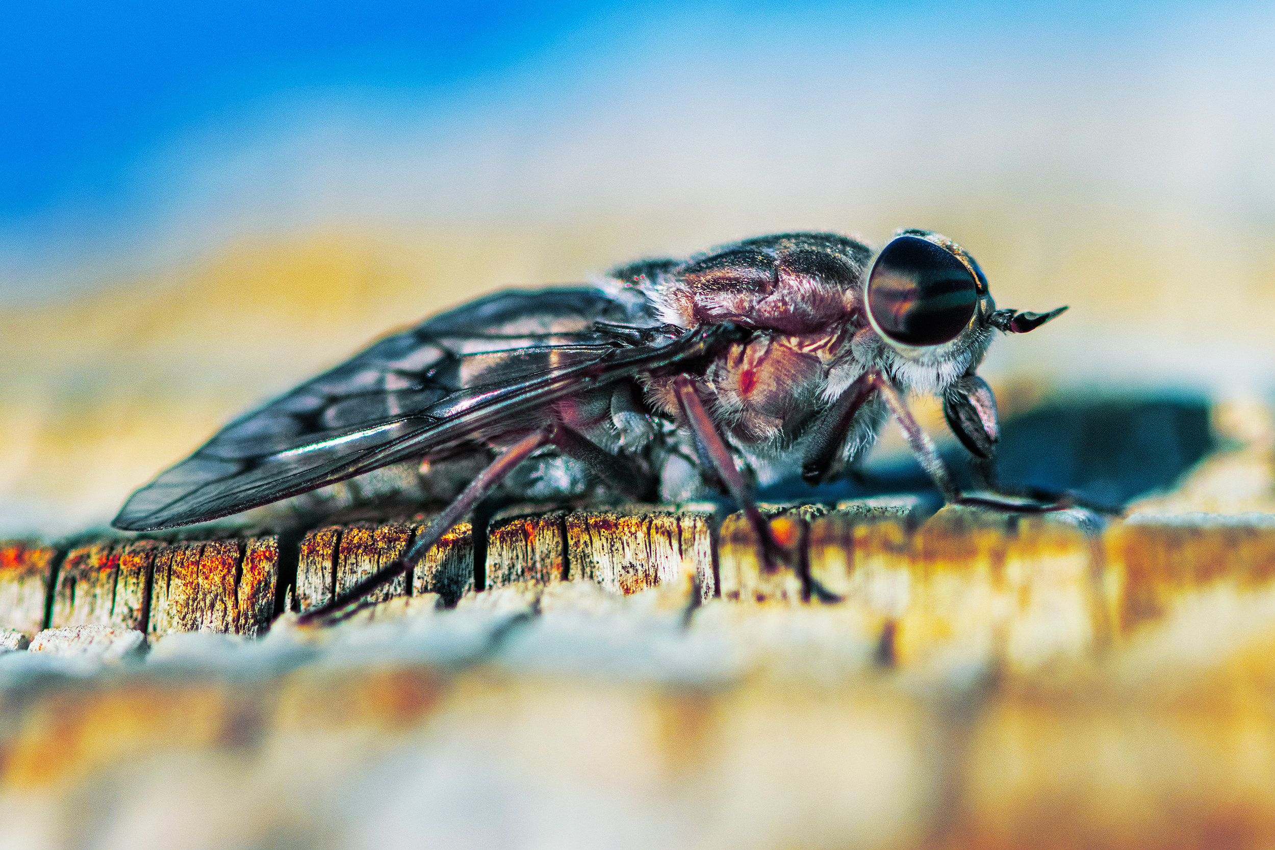 Laramie Greenbelt Trail horse fly resting among cracked wood macro shot captured outdoors on July 15th 2025 at 8:22 AM during a warm, cloudy, sunny and windy summer morning by Laramie Wyoming photographer Sean Michael Datz using a Nikon D850 camera with Sigma TC-2001 2x Teleconverter and Sigma 105mm macro lens at a focal length distance of 210mm.