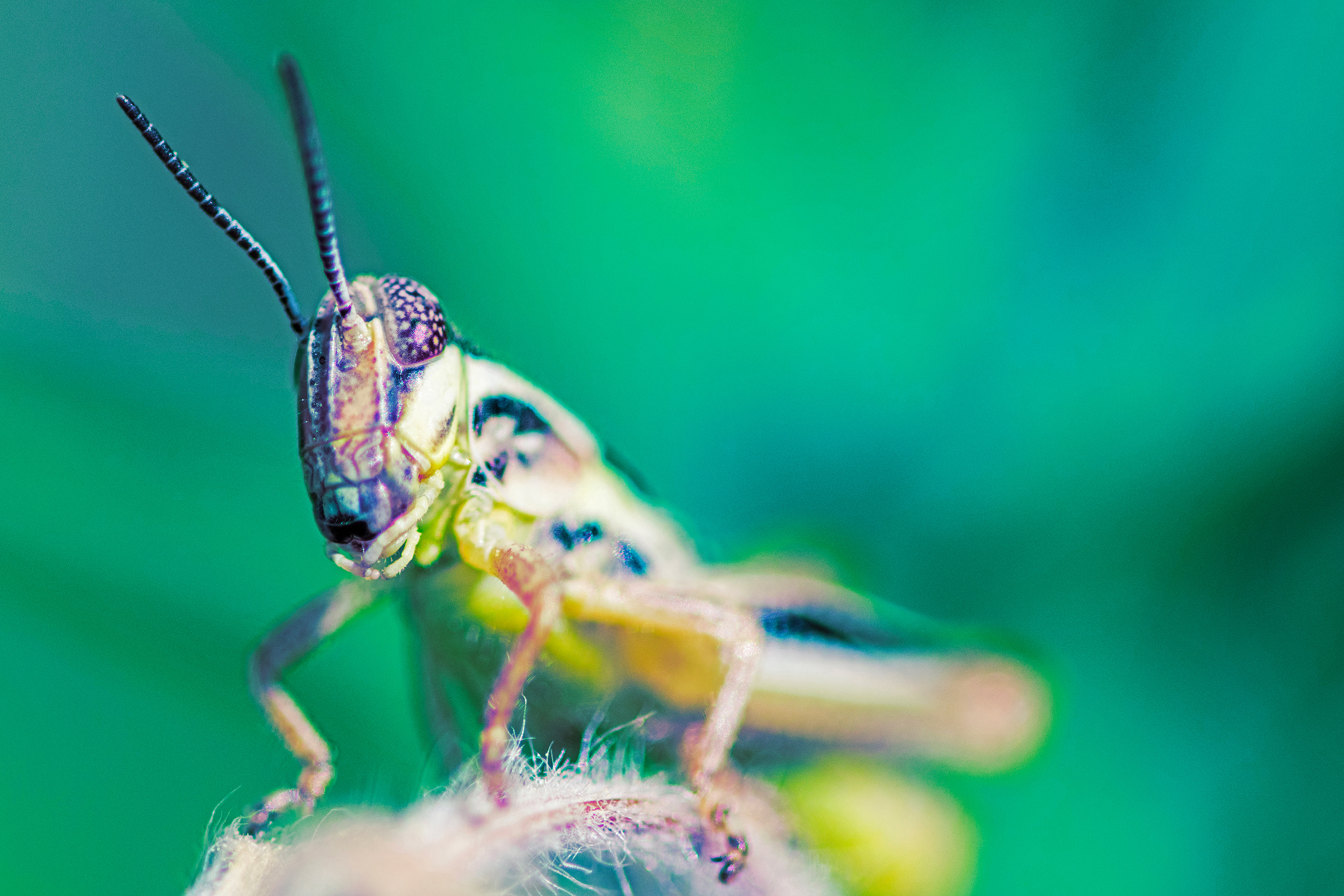 Laramie Greenbelt Trail joyful grasshopper standing among fuzzy plant top macro shot captured outdoors on August 4th 2024 at 8:26 AM during a warm, cloudy, smoky and sunny summer morning by Laramie Wyoming photographer Sean Michael Datz using a Nikon D850 camera with Sigma TC-2001 2x Teleconverter and Sigma 105mm macro lens at a focal length distance of 210mm.