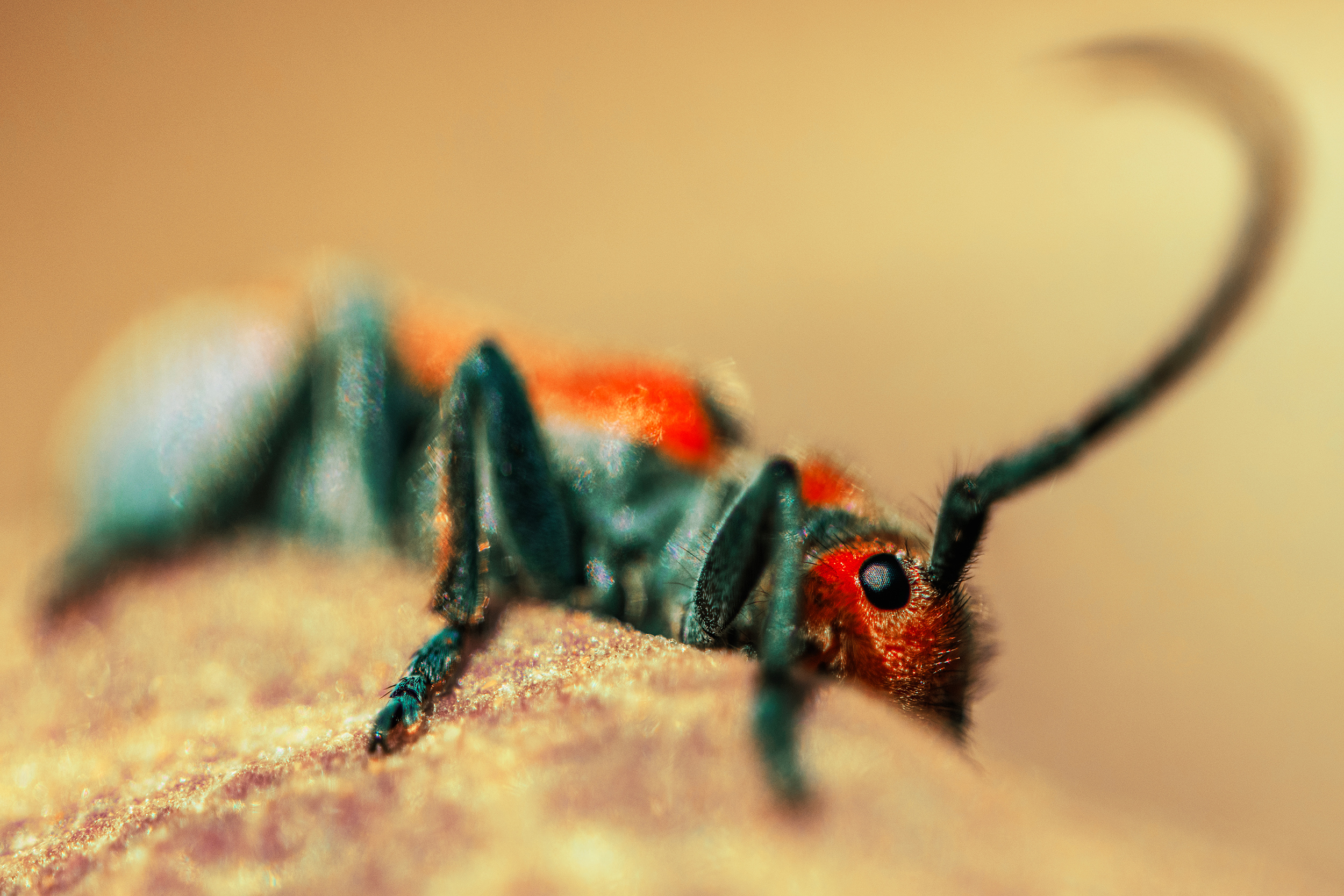 Laramie Greenbelt Trail milkweed beetle hiding behind leaf petal macro shot captured outdoors on August 10th 2024 at 7:48 AM during a cool, cloudy and sunny summer morning by Laramie Wyoming photographer Sean Michael Datz using a Nikon D850 camera with Sigma TC-2001 2x Teleconverter and Sigma 105mm macro lens at a focal length distance of 210mm.