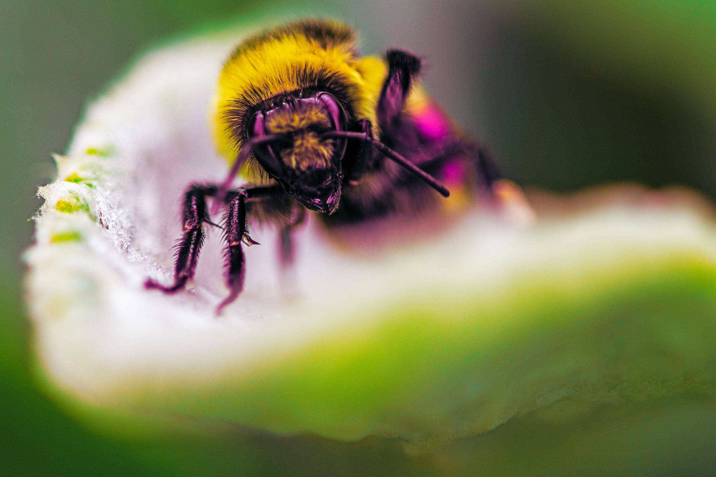 LaBonte Park red belted bumble bee crawling flower petal edge macro shot captured outdoors on August 8th 2023 at 8:22 AM during a warm, cloudy and sunny summer morning by Laramie Wyoming photographer Sean Michael Datz using a Nikon D850 camera with Sigma TC-2001 2x Teleconverter and Sigma 105mm macro lens at a focal length distance of 210mm.