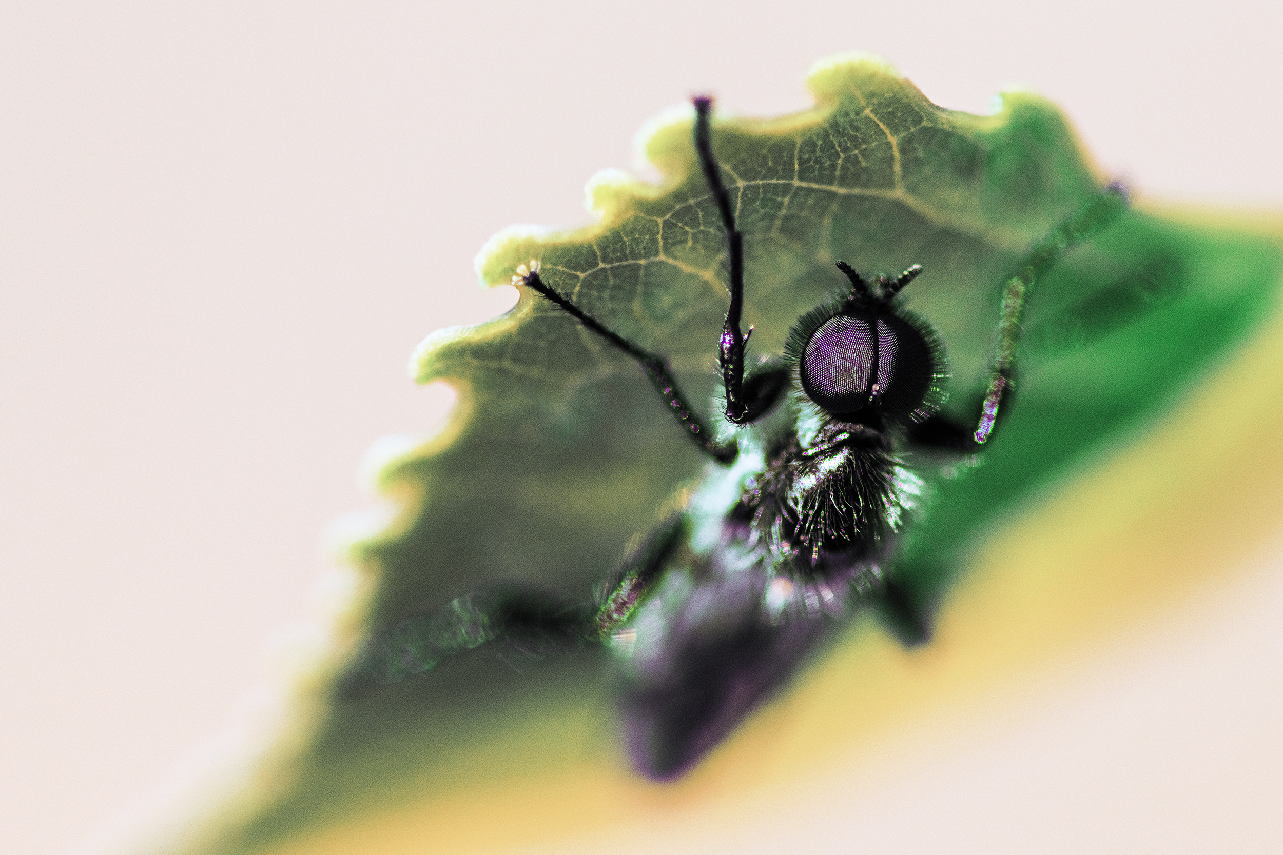 Pilot Hill Trail resting march fly seeks shade beneath leaf petal macro shot captured outdoors on May 27th 2025 at 9:00 AM during a cool, cloudy and overcast spring morning by Laramie Wyoming photographer Sean Michael Datz using a Nikon D850 camera with Sigma TC-2001 2x Teleconverter and Sigma 105mm macro lens at a focal length distance of 210mm.