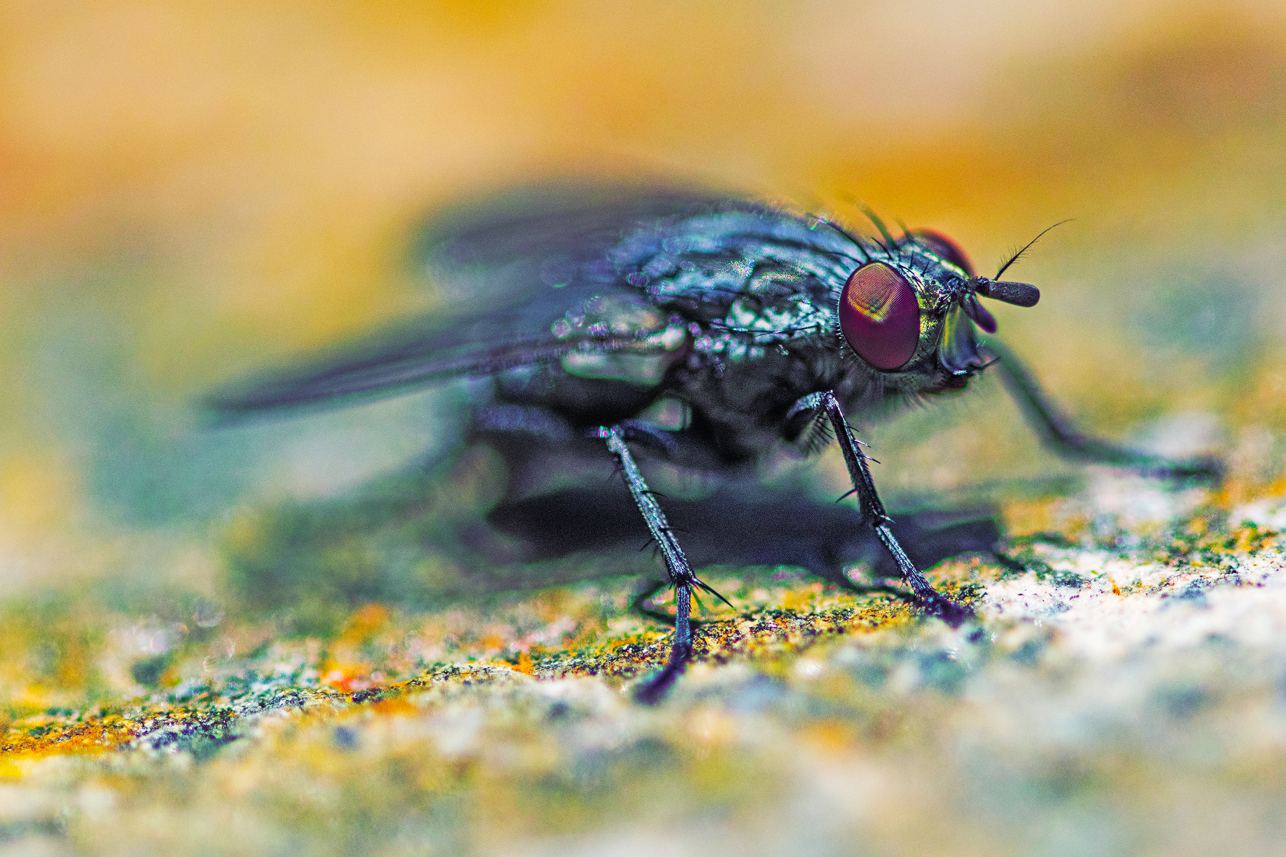 LaBonte Park standing cluster fly getting suntan atop rock macro shot captured outdoors on July 10th 2025 at 7:49 AM during a warm, cloudy, sunny and windy summer morning by Laramie Wyoming photographer Sean Michael Datz using a Nikon D850 camera with Sigma TC-2001 2x Teleconverter and Sigma 105mm macro lens at a focal length distance of 210mm.