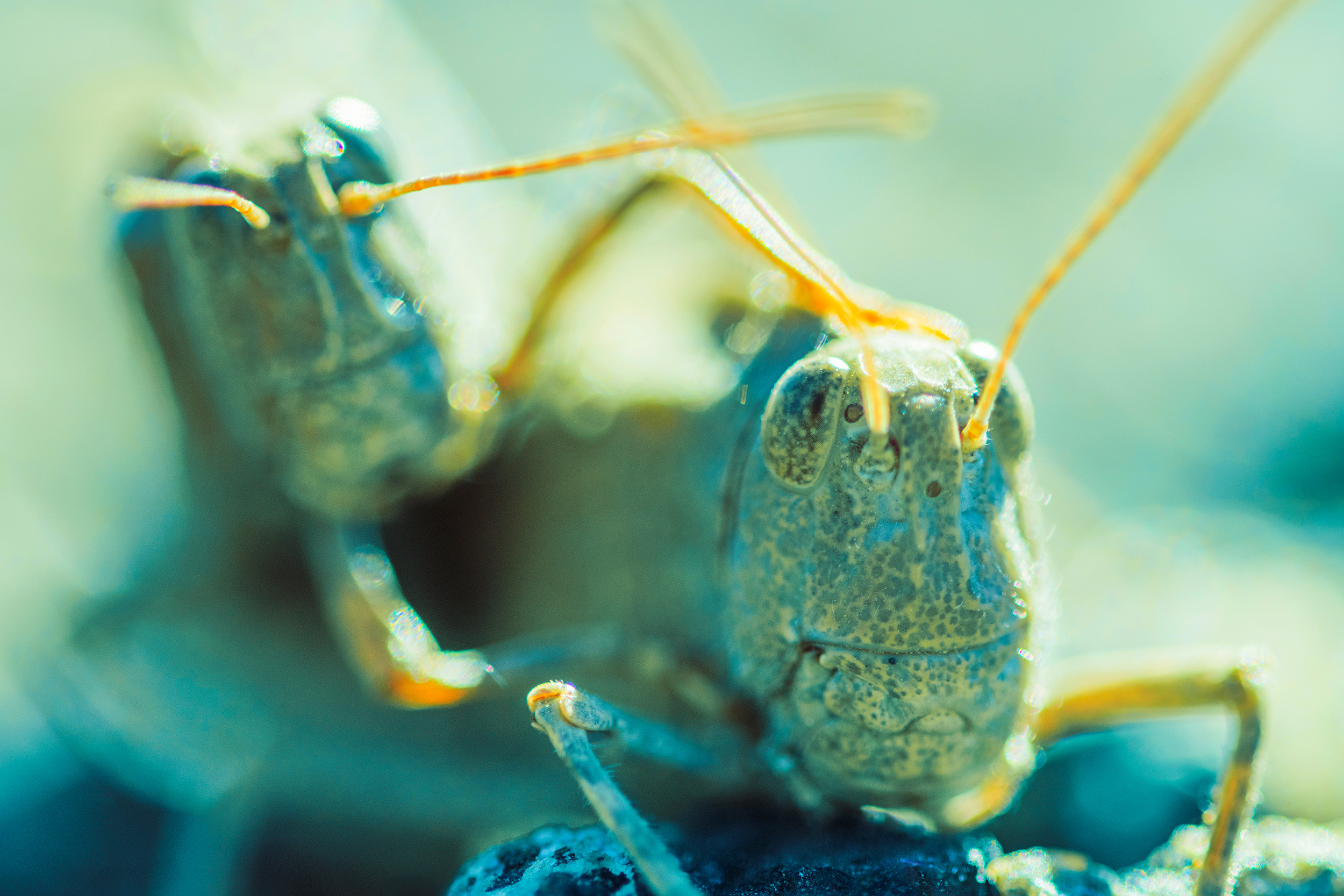 Laramie Greenbelt Trail two grasshopper buddies smiling among sunlight macro shot captured outdoors on October 7th 2023 at 2:28 PM during a warm, sunny and windy autumn afternoon by Laramie Wyoming photographer Sean Michael Datz using a Nikon D850 camera with Sigma TC-2001 2x Teleconverter and Sigma 105mm macro lens at a focal length distance of 210mm.