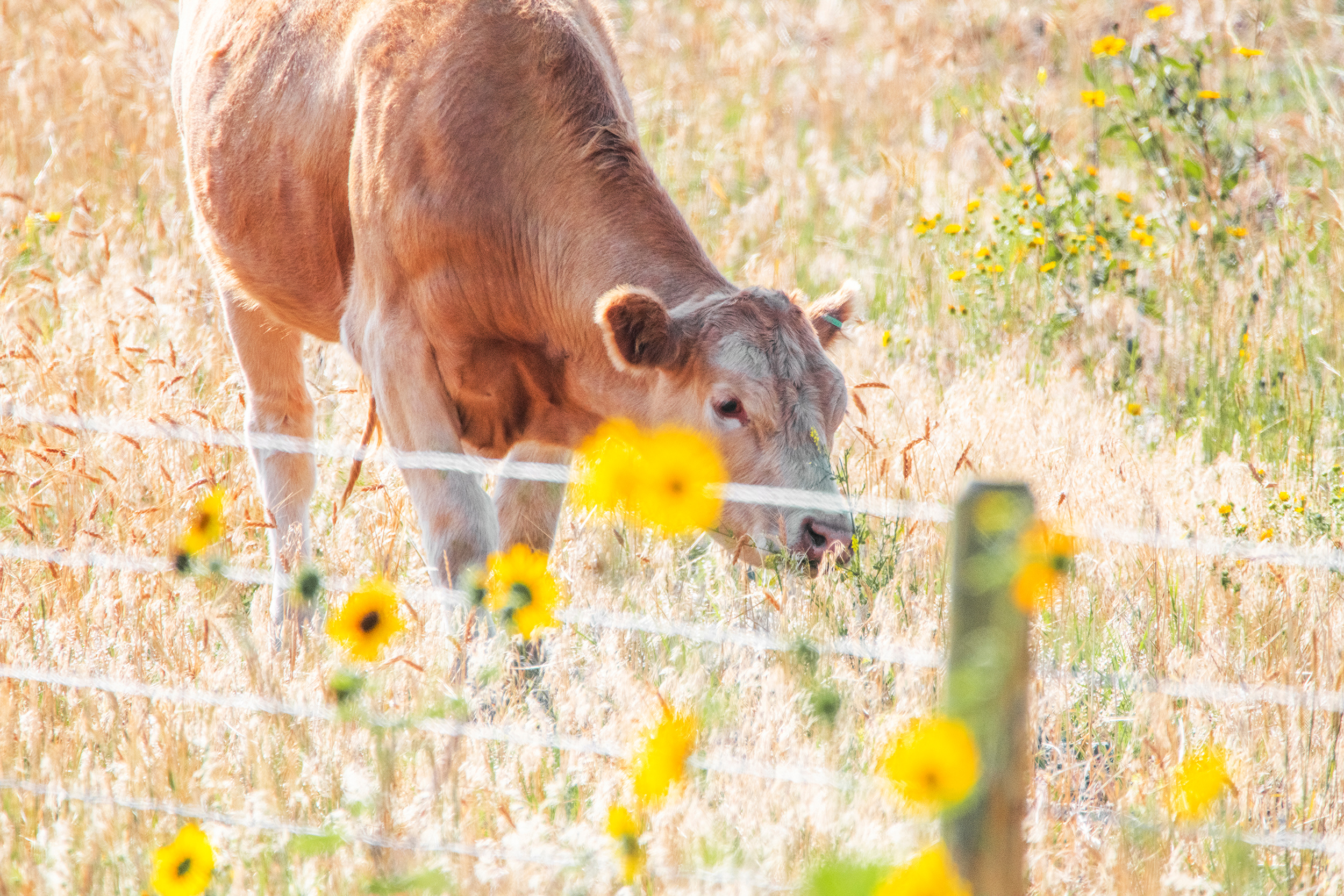 Interstate 80 cow snacking on grass behind fence telephoto shot captured outdoors on August 14th 2021 at 8:57 AM during a warm, cloudy, sunny and windy summer morning by Laramie Wyoming photographer Sean Michael Datz using a Nikon D850 camera with Sigma TC-2001 2x Teleconverter and Sigma 150-600mm telephoto lens at a focal length distance of 1200mm.