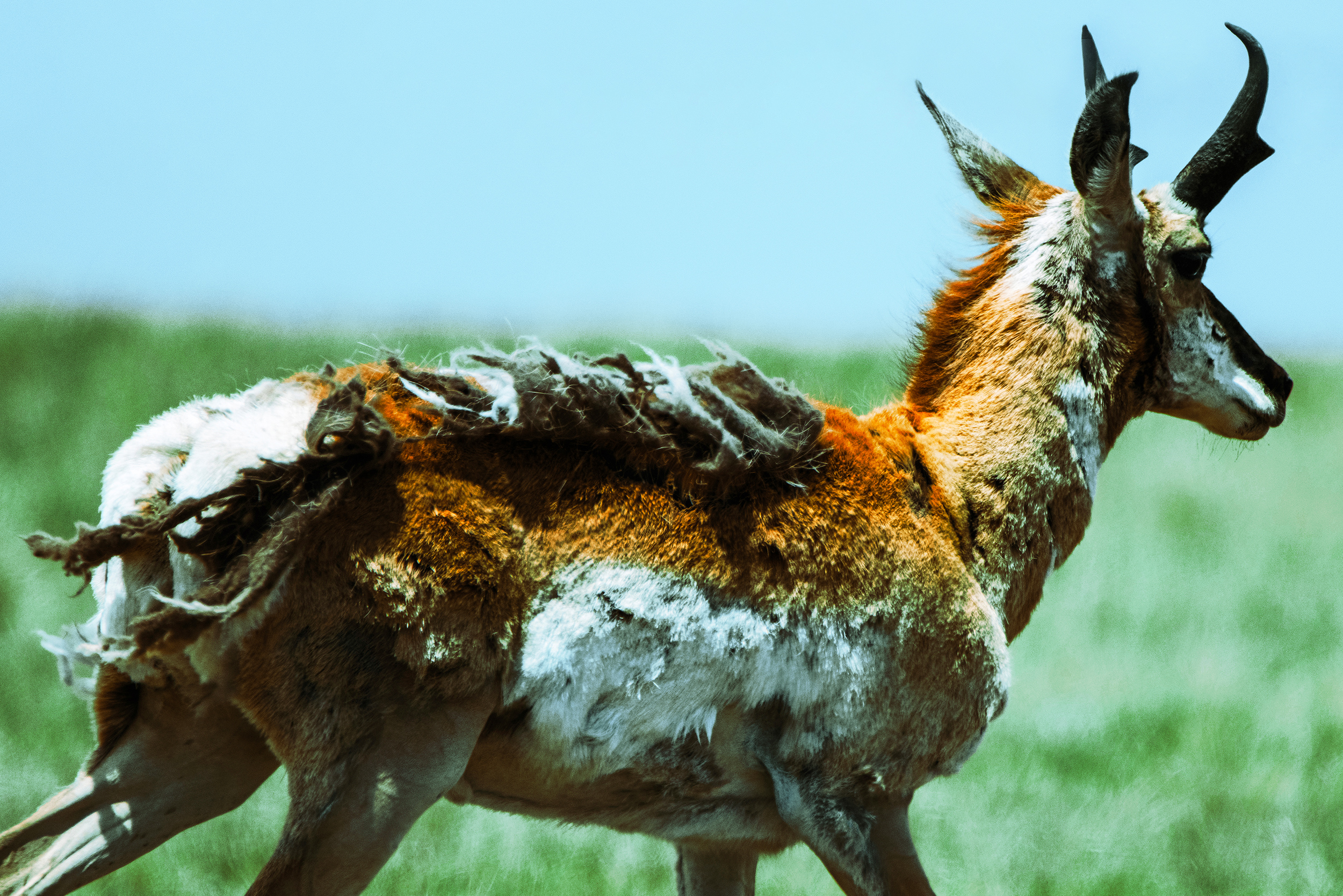 Cirrus Sky Technology Park fur shedding pronghorn walking along grass telephoto shot captured outdoors on June 1st 2023 at 12:55 PM during a warm, cloudy, sunny and windy summer afternoon by Laramie Wyoming photographer Sean Michael Datz using a Nikon D850 camera with Sigma TC-2001 2x Teleconverter and Sigma 150-600mm telephoto lens at a focal length distance of 1200mm.