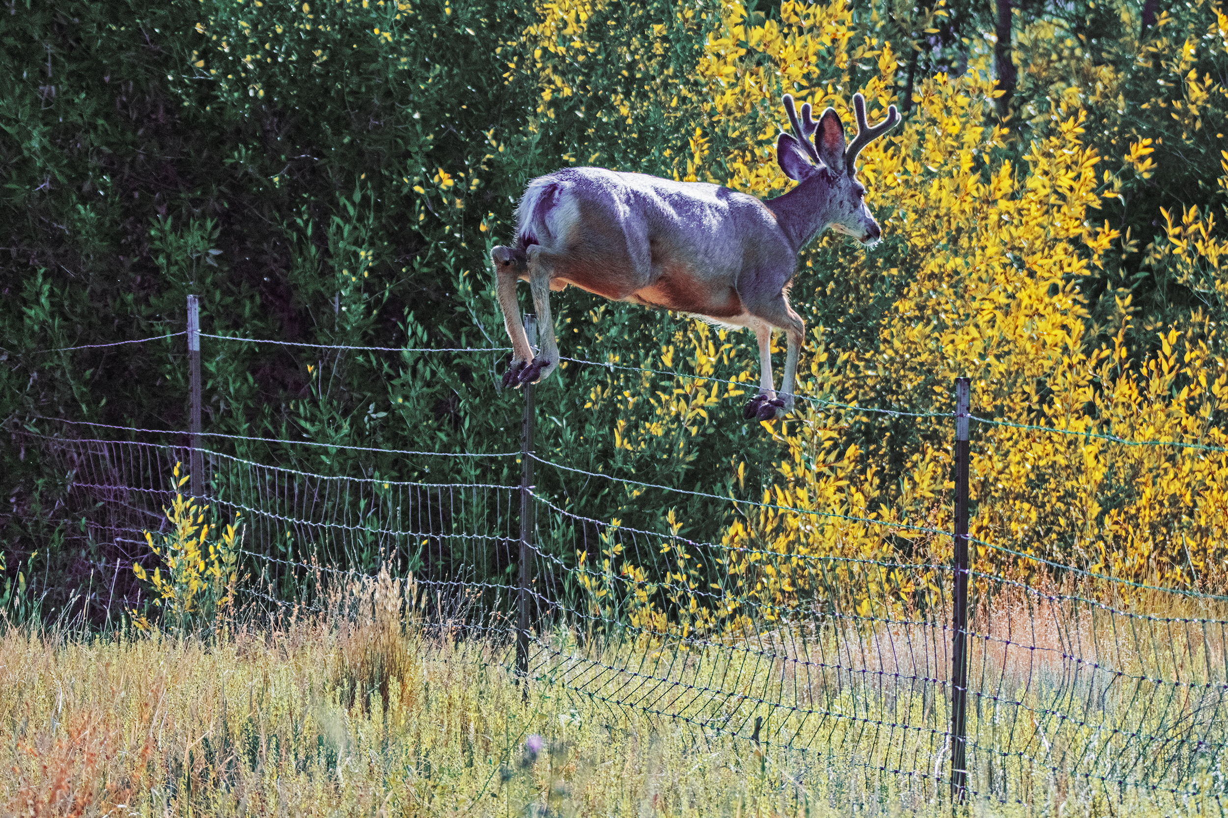 Midair Soaring Mule Deer Flying Over Fence (Color)