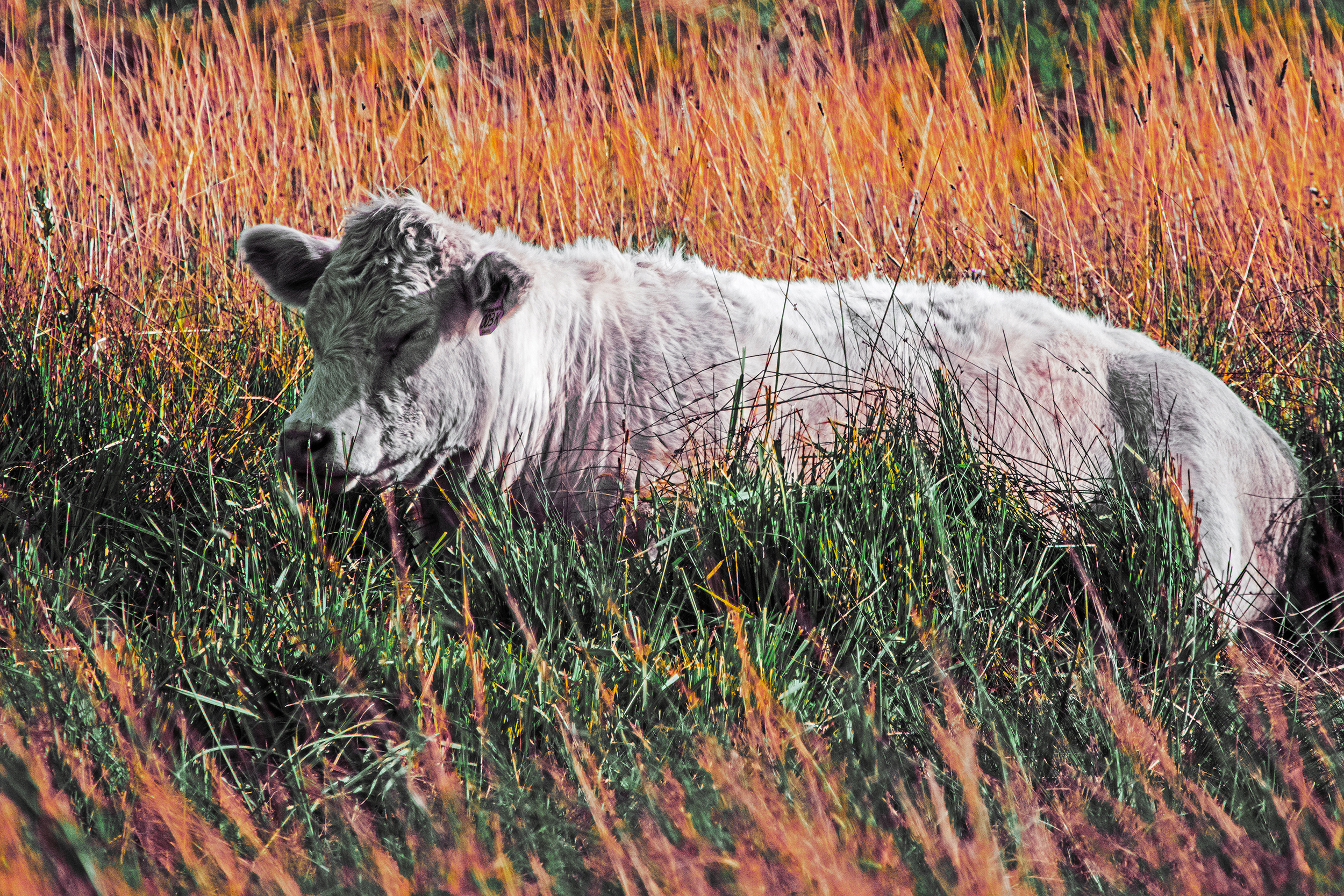 Laramie Greenbelt Trail sleeping cow resting among grass telephoto shot captured outdoors on August 11th 2023 at 5:22 PM during a hot, cloudy, sunny and windy summer evening by Laramie Wyoming photographer Sean Michael Datz using a Nikon D850 camera with Sigma TC-2001 2x Teleconverter and Sigma 150-600mm telephoto lens at a focal length distance of 1200mm.