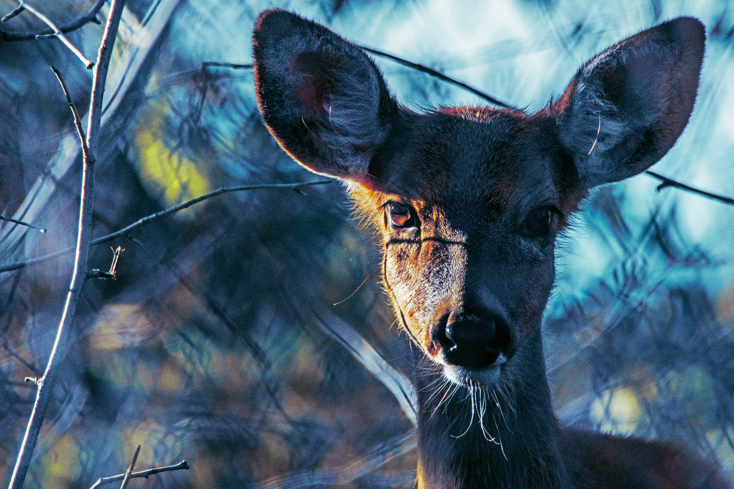 Sunrise Illuminates White Tailed Deer Among Tree Shadows (Cyan Tone)
