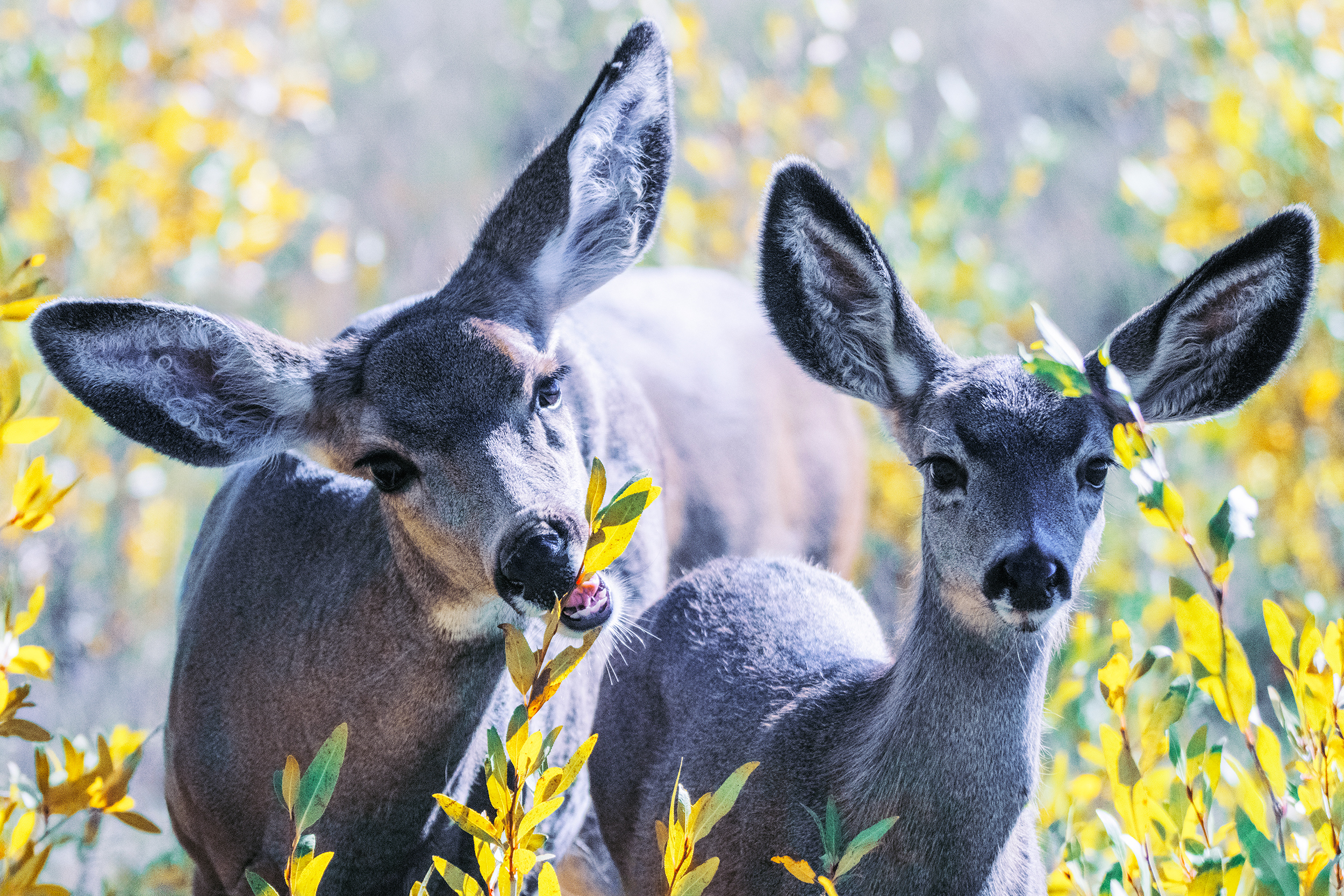 Laramie Greenbelt Trail two mule deer enjoying leafy breakfast telephoto shot captured outdoors on September 26th 2025 at 10:20 AM during a warm, sunny and windy autumn morning by Laramie Wyoming photographer Sean Michael Datz using a Nikon D850 camera with Sigma TC-2001 2x Teleconverter and Sigma 150-600mm telephoto lens at a focal length distance of 300mm.