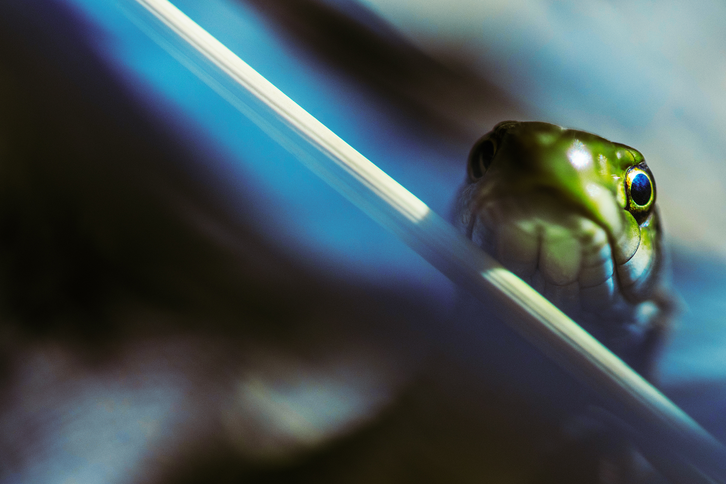 Laramie Greenbelt Trail garter snake peeking head over dried fescue grass blade macro shot captured outdoors on May 12th 2024 at 9:16 AM during a warm, cloudy, sunny and windy spring morning by Laramie Wyoming photographer Sean Michael Datz using a Nikon D850 camera with Sigma TC-2001 2x Teleconverter and Sigma 105mm macro lens at a focal length distance of 210mm.