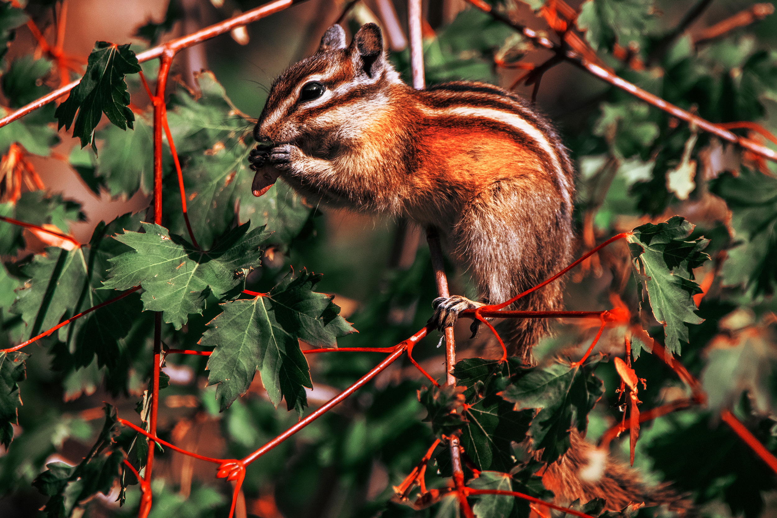 Vedauwoo Forest chipmunk feasting on tree branches telephoto shot captured outdoors on September 1st 2022 at 9:20 AM during a warm, overcast and sunny autumn morning by Laramie Wyoming photographer Sean Michael Datz using a Nikon D850 camera with Sigma TC-2001 2x Teleconverter and Sigma 150-600mm telephoto lens at a focal length distance of 1200mm.