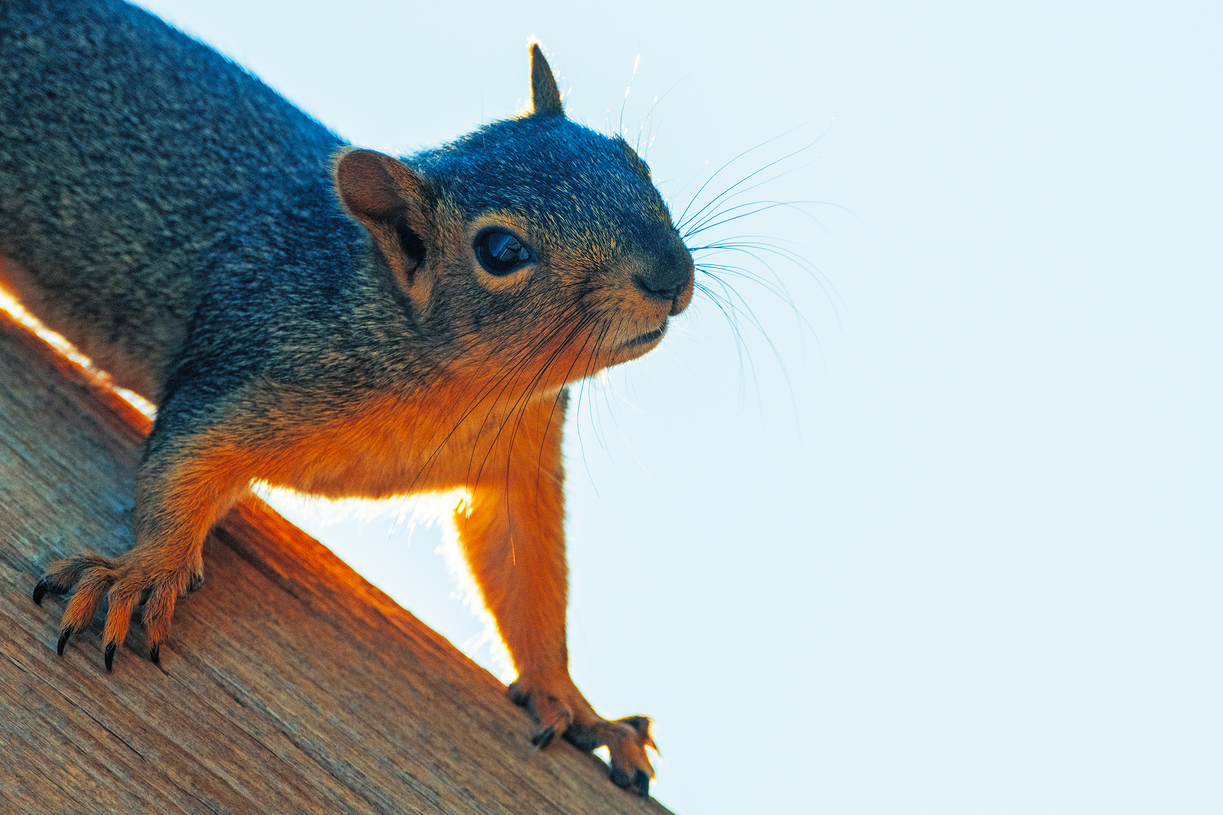 Confused Head Tilting Squirrel Standing Along Wooden Pole (Blue Shade)