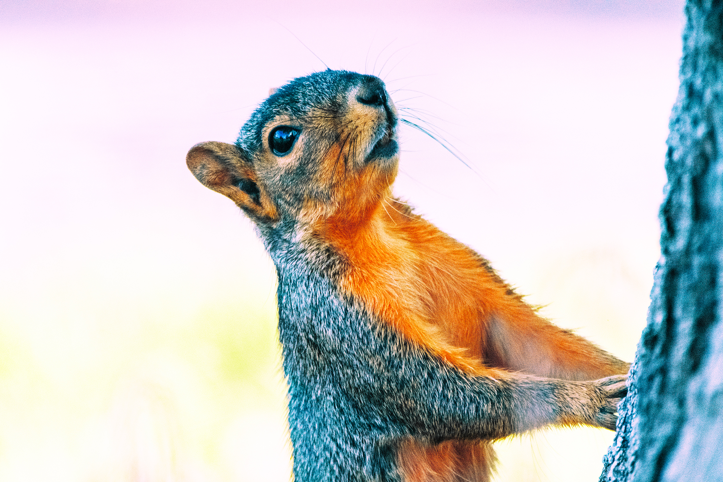 LaBonte Park squirrel glances up tree trunk telephoto shot captured outdoors on July 23rd 2023 at 8:13 AM during a warm, cloudy, sunny and windy summer morning by Laramie Wyoming photographer Sean Michael Datz using a Nikon D850 camera with Sigma TC-2001 2x Teleconverter and Sigma 150-600mm telephoto lens at a focal length distance of 1200mm.