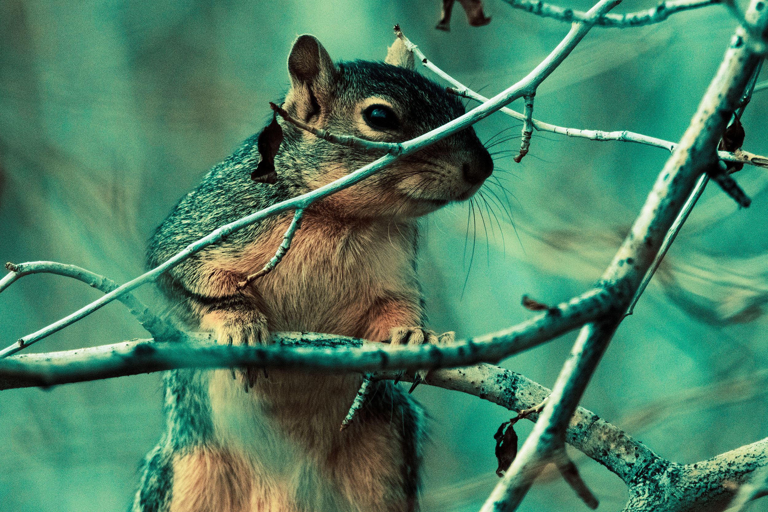 Standing Squirrel Peeking Over Tree Branch (Cyan Tint)